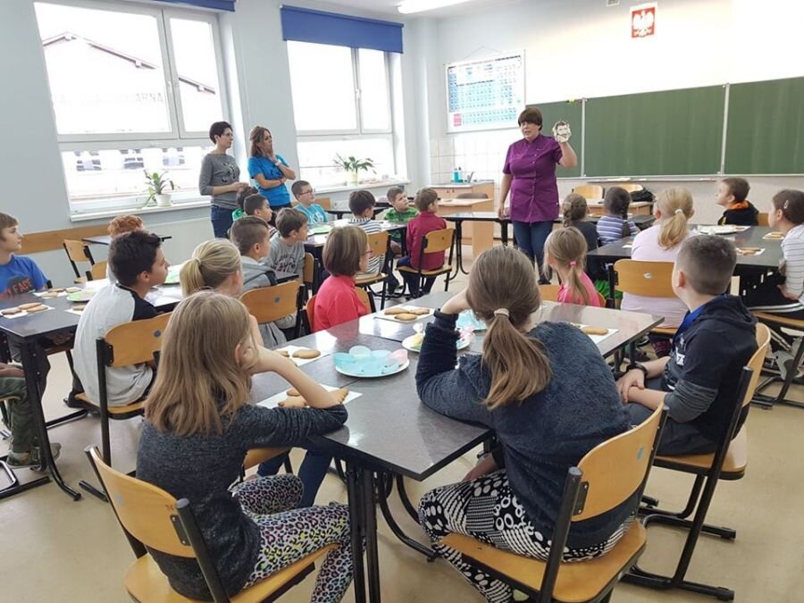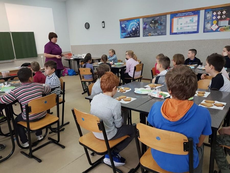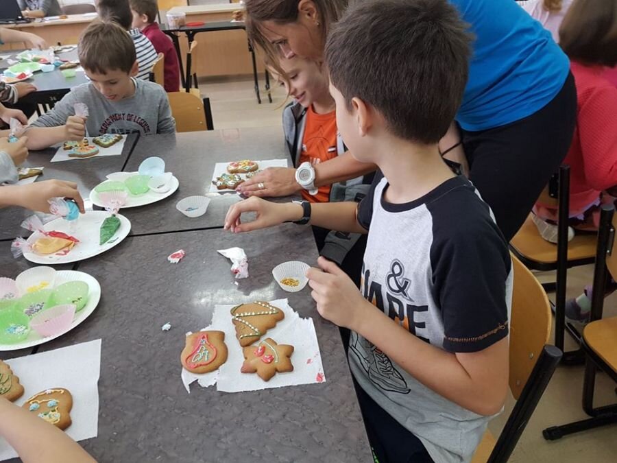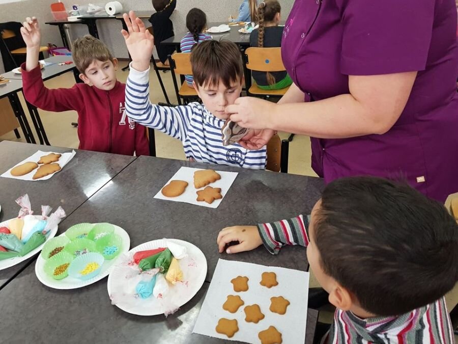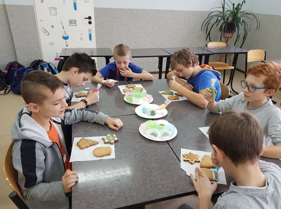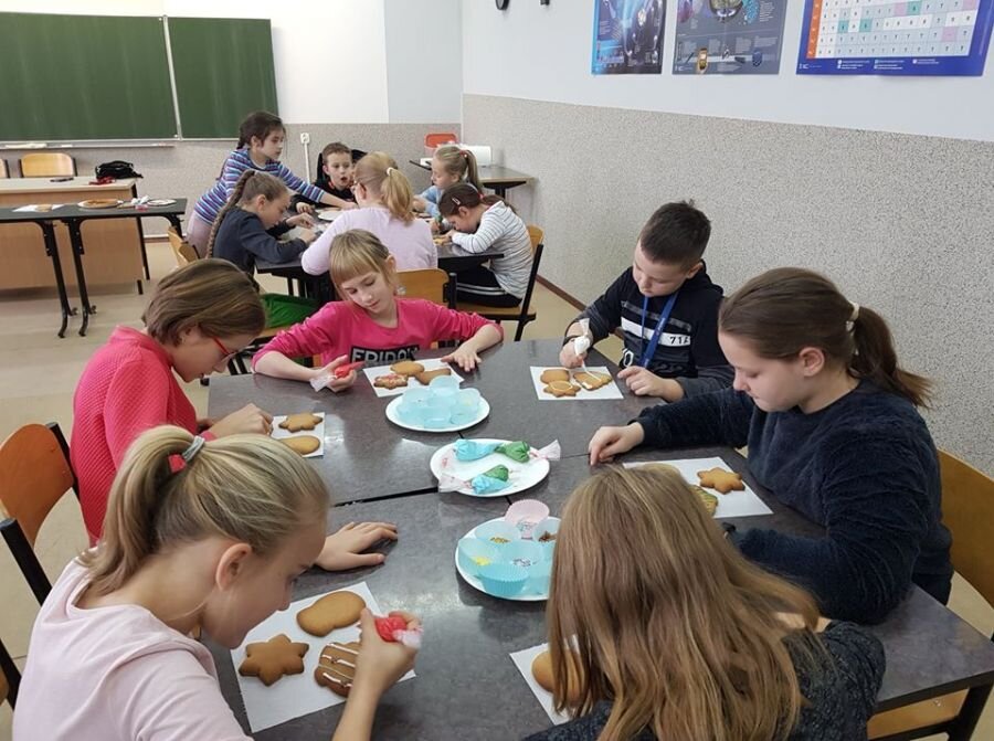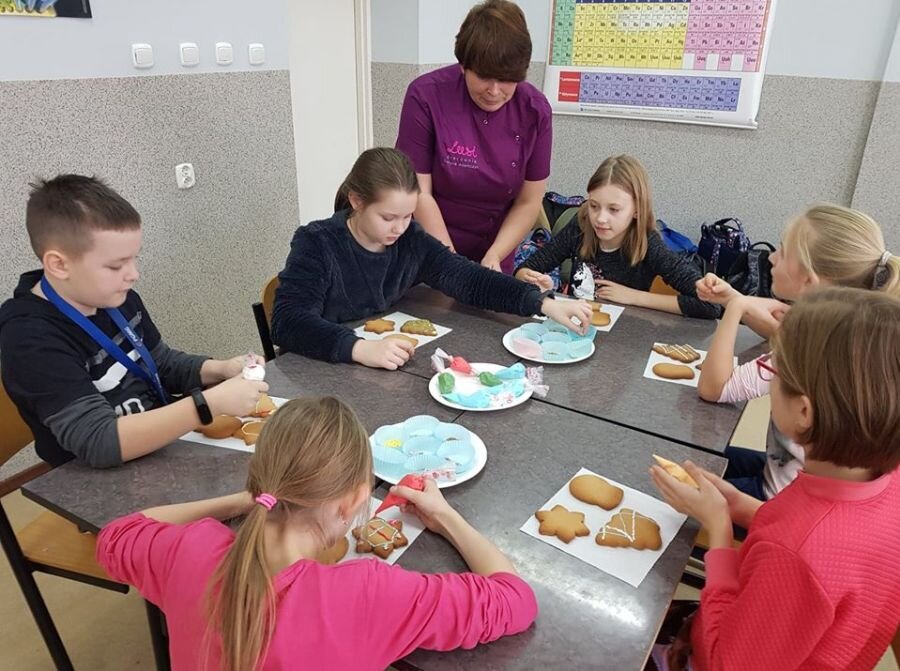 We wtorek 17 grudnia, uczniowie klasy 4a uczestniczyli w warsztatach zdobienia pierników. Warsztaty przeprowadziła pani Lucyna Adamczyk, która na co dzień zajmuje się cukiernictwem. Przez wiele lat doskonali swoje rzemiosło i cały czas dzieli się swoimi umiejętnościami z innymi. Pani Lucyna opowiedziała dzieciom jak upiec dobre pierniki, w jaki sposób zrobić najlepszy lukier oraz zdradziła kilka sekretów na temat zdobienia wypieków.
