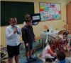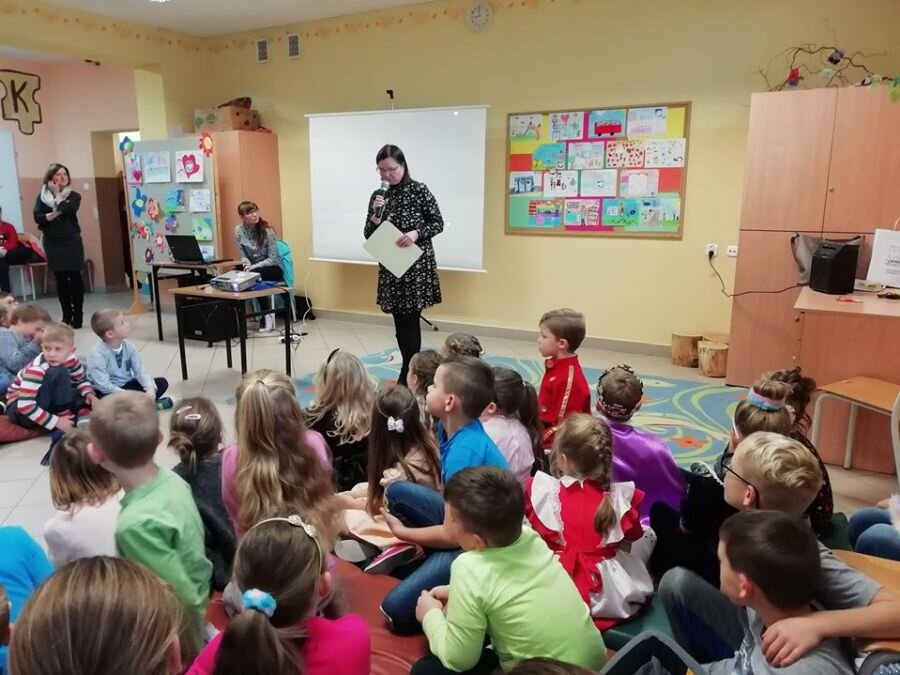 Po przeczytanej bajce przez pana Mateusza, pani Agnieszka Sztwiertnia- bibliotekarz, czytała wymyślone przez obecnych pierwszoklasistów opowiadanie pt. „Bajka o Kosi”.