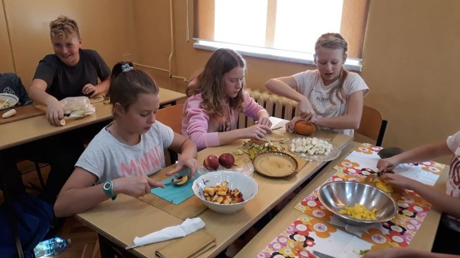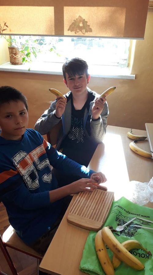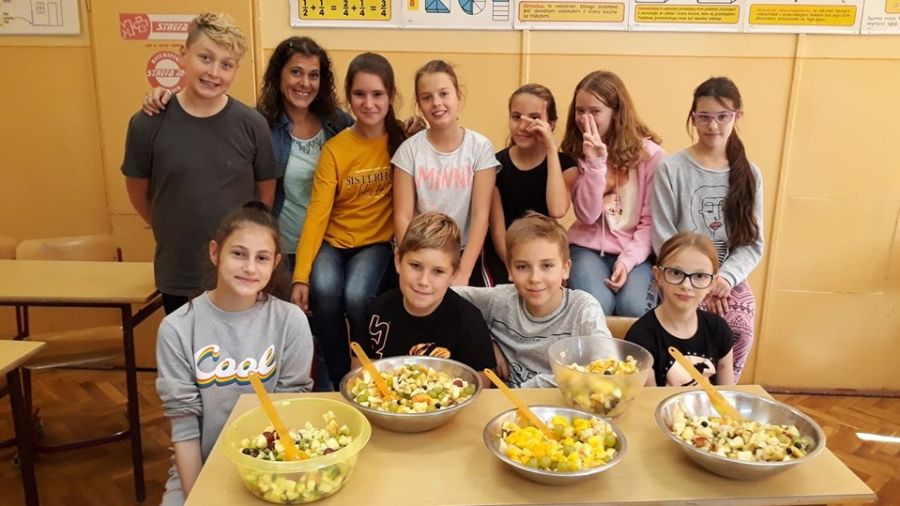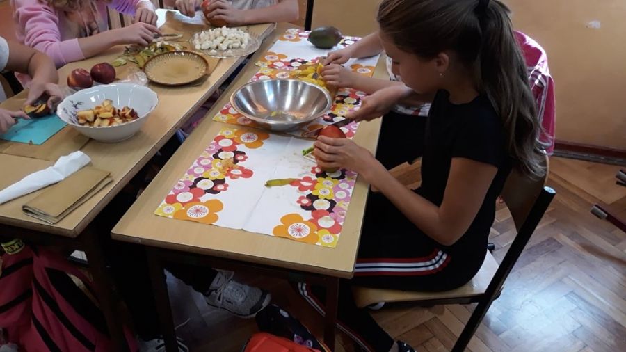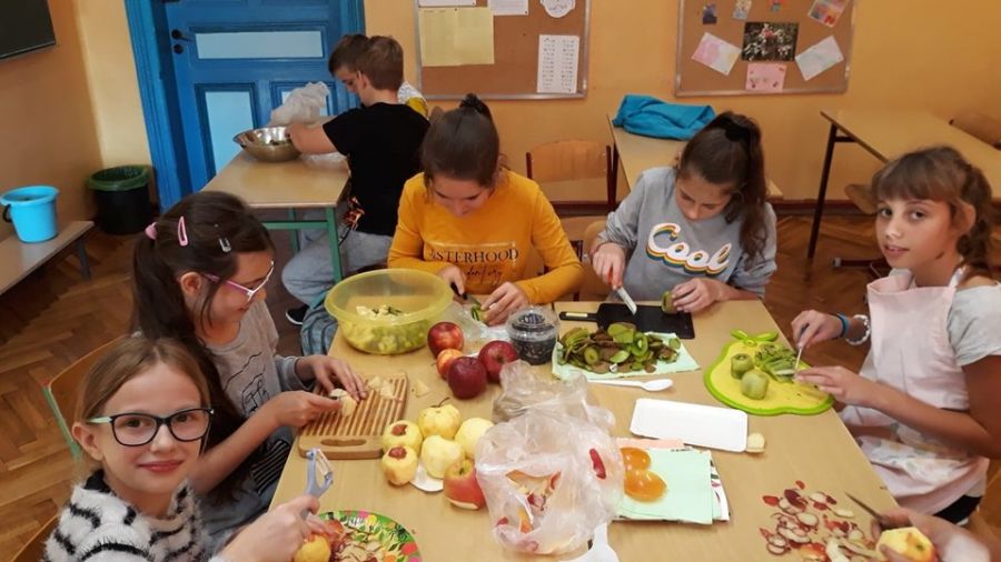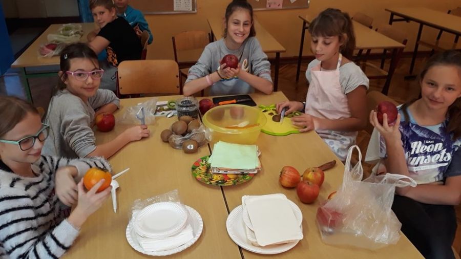 W ramach programu „Trzymaj formę” wychowawczyni klasy 6c przeprowadziła na lekcji wychowawczej pogadankę na temat zdrowego i niezdrowego odżywiania oraz witamin. Następnie klasa przygotowała sałatkę owocową, którą potem wszyscy zjedli ze smakiem.