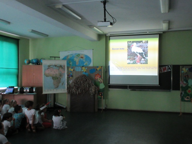 Pan Tomasz, nauczyciel przyrody w prezentacji multimedialnej pokazał ciekawe przyrodniczo zdjęcia i przekazał dzieciom informacje o bocianach. Dzieci dowiedziały się, że Polska to bociania potęga a co czwarty bociek to Polak.