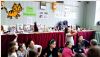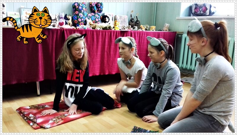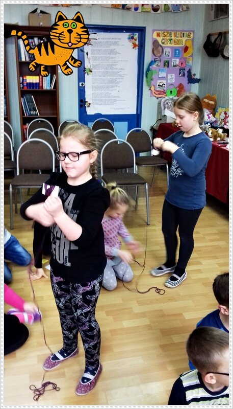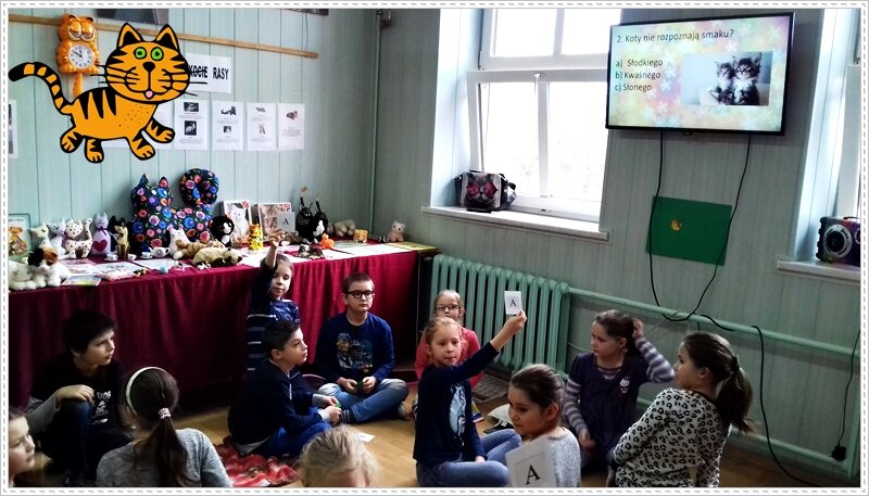 Lekcja biblioteczna rozpoczęła się od krótkiego przedstawienia pt. „Kot i myszy”, przygotowanego przez dziewczynki z aktywu bibliotecznego. Następnie dzieci obejrzały prezentację multimedialną, w której przedstawione zostały ciekawostki dotyczące kotów, wiersze i bajki z kotem w roli głównej. Pojawił się także motyw kota w malarstwie i rzeźbie. Nie zabrakło kocich zabaw, takich jak picie mleka z miseczki, zwijanie włóczki, układanie puzzli z kotami połączone ze zgadywankami – jak nazywa się ten kot ?, co to za bajka ?. Z radością dzieci bawiły się w dawne zabawy „uciekaj myszko do dziury”, quiz wiedzy. Dzieci poznały kocie przysłowia oraz wysłuchały opowiadania Renaty Piątkowskiej pt. „Gdy kot śpi, myszy harcują”. Na końcu Julia sprawiła wszystkim niespodziankę prezentując kotkę Lilę, która była gościem specjalnym dnia. Dzieci mogły ją pogłaskać i zrobić pamiątkowe, klasowe zdjęcie.