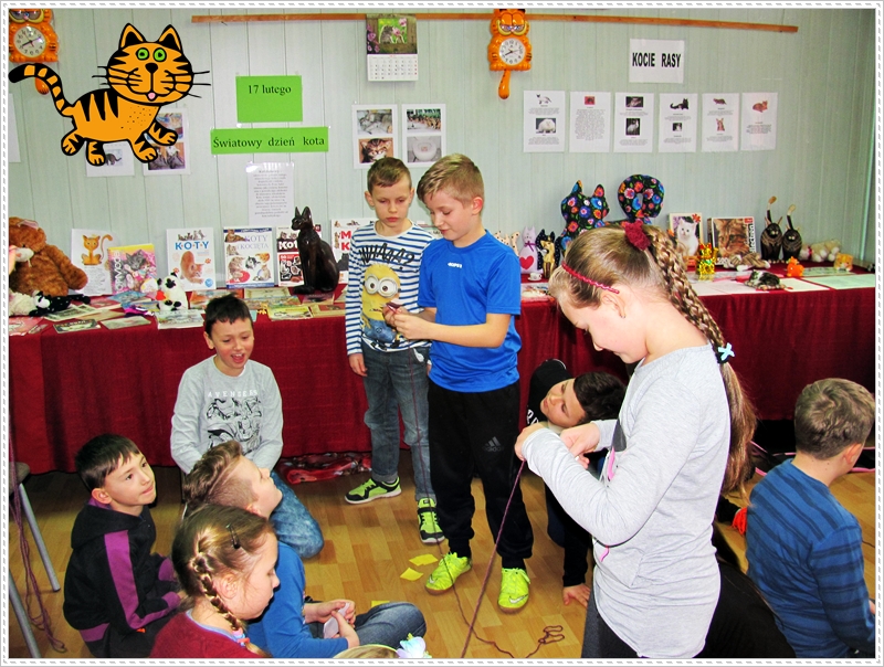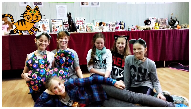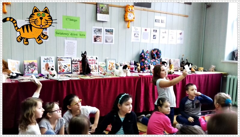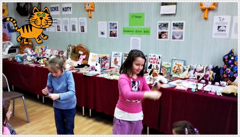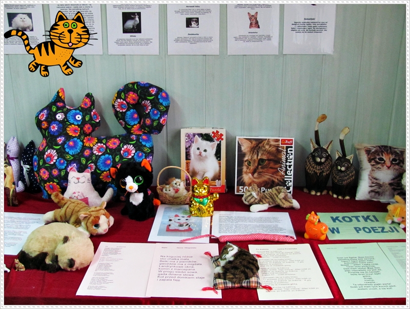 Bibliteka włączyła się w obchody kociego święta poprzez wystawę oraz lekcję biblioteczną. Inspiratorką wystawy była czytelniczka z klasy 4 – Julka Harwot – właścicielka kota, posiadaczka pokaźnego zbioru książek o kotach i sporej ilości kocich gadżetów. Na wystawie znalazły się także rzeczy przyniesione przez innych naszych czytelników np. pluszowe maskotki, karteczki i obrazki, a także drewniane, p[porcelanowe i szklane figurki kotów. Pojawił się także posąg kota przywiezionego z Egiptu. Nie zabrakło książek o kocich rasach i kalendarzy. Ekspozycja sprawiła wielką radość zarówno tym, którzy ją tworzyli, jak i oglądającym.