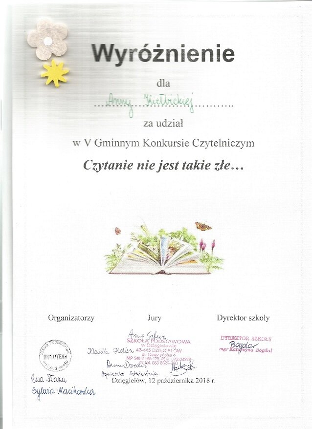 12 października 2018 r. po raz piąty odbył się w Szkole Podstawowej w Dzięgielowie Gminny Konkurs Czytelniczy pod hasłem „Czytanie nie jest takie złe…”. Konkurs zorganizowały i przeprowadziły panie: Ewa Płaza oraz Sylwia Macihorska. Uczniowie z czterech szkół naszej gminny popisywali się znajomością treści dwóch książek: „Magiczne drzewo” oraz „Charlie i fabryka czekolady”. Jak zwykle wykazali się dużą wiedzą podczas rozwiązywania testów.