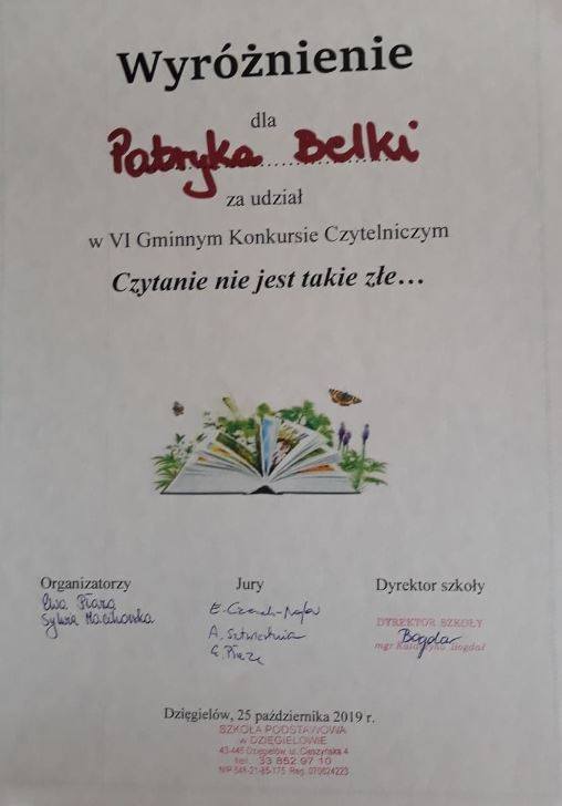 25 października odbył się VI Gminny Konkurs Czytelniczy "Czytanie nie jest takie złe". Organizatorem konkursu była Szkoła Podstawowa w Dzięgielowie. W konkursie wzięło udział trzech naszych uczniów: Julia Sikora z klasy 8a, Julia Harwot z klasy 7b oraz Patryk Belka z klasy 5b.Julia Harwot zdobyła III miejsce, a Patryk Belka -wyróżnienie. Gratulujemy!