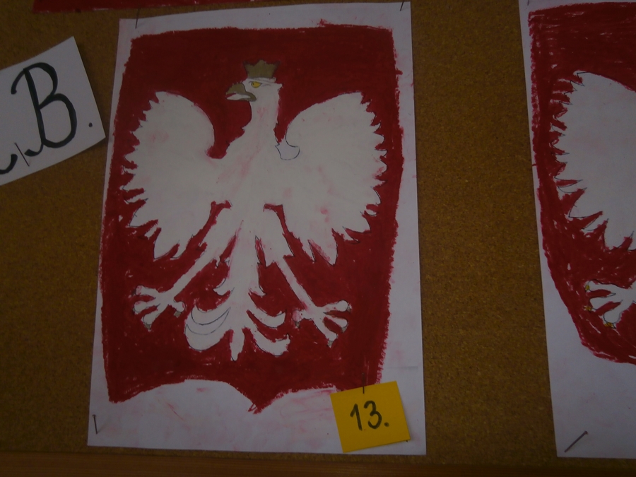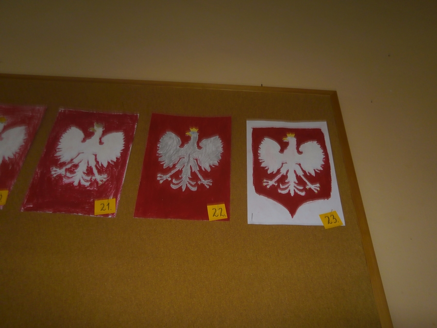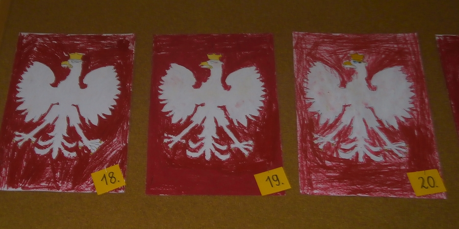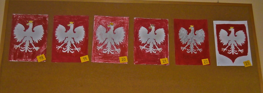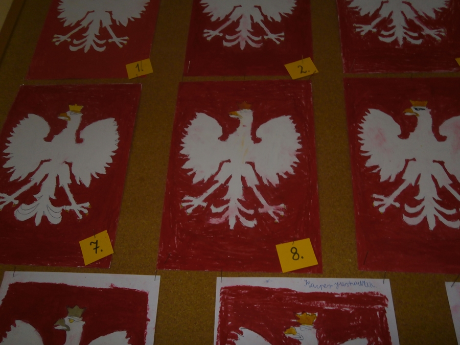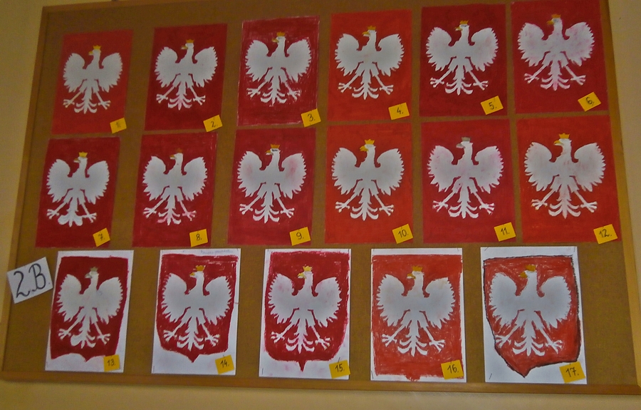 Uczniowie klasy 2b z okazji Święta Niepodległości wykonywali godła Polski wykorzystując szablony i różne techniki plastyczne. Wśród uczniów klas 4 przeprowadzono głosowanie na najciekawsze i najbardziej staranne prace.