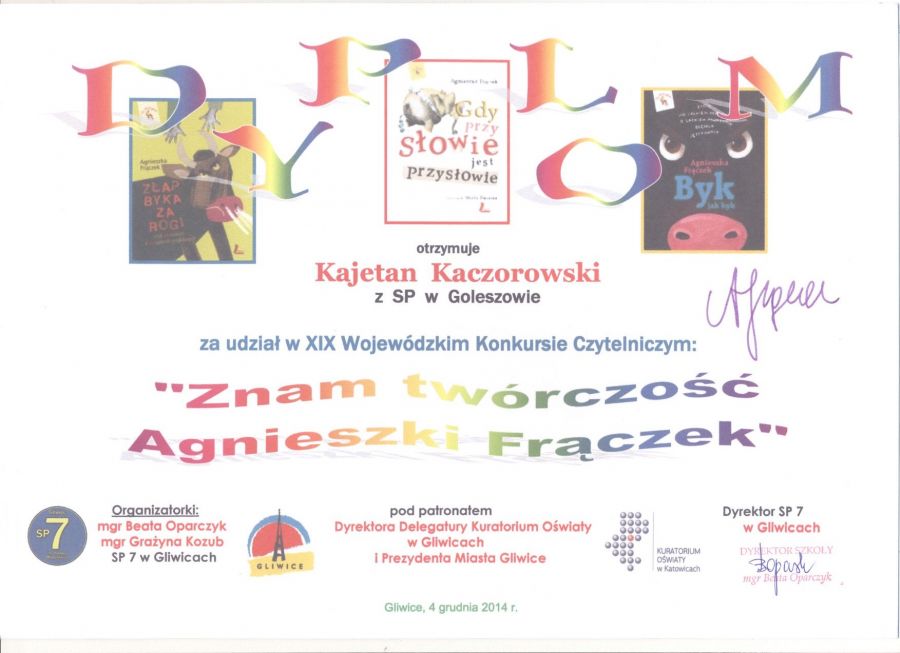 4 grudnia w Gliwicach odbył się Wojewódzki Konkurs "Czy znam twórczość Agnieszki Frączek" dla uczniów klas 3. Z naszej szkoły do konkursu przygotowywali się pod okiem p. Urszuli Łamacz uczniowie: Kajetan i Kacper Kaczorowscy.