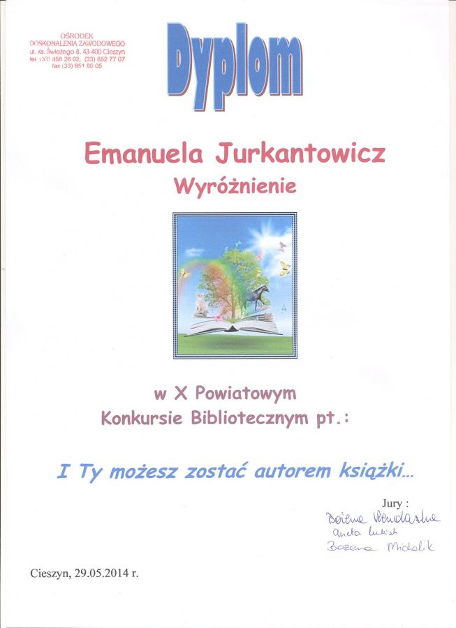 W konkursie bibliotecznym pt. "Jestem autorem", organizowanym przez Ośrodek Doskonalenia Zawodowego w Cieszynie nasze uczennice z klasy 6b- Emanuela Jurkantowicz i Paulina Śliwka zdobyły wyróznienie!
