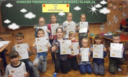 W klasie 2a odbył się konkurs pięknego czytania. Dzieci czytały wiersz pt."List od Października". Podczas oceniania pod uwagę brano płynność, głośność, wyrazistość i poprawność. Oprócz czytania uczniowie sami próbowali oceniać i uczyli się jak sprawiedliwie wyłaniać zwycięzców.