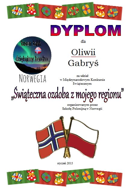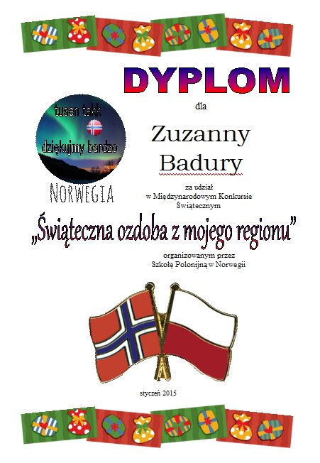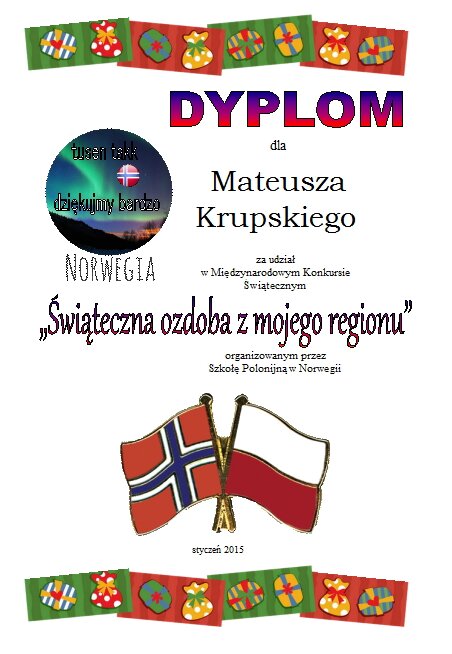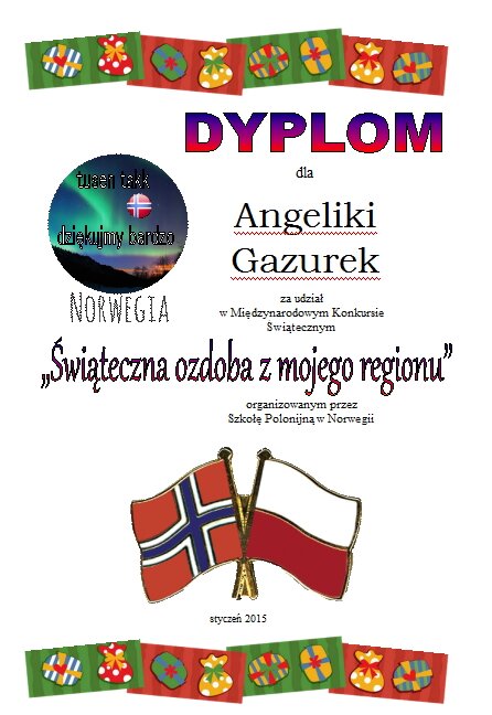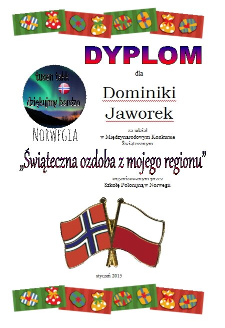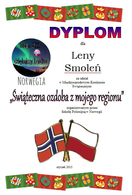 Szkoła Polska w Norwegii zorganizowała konkurs "Świąteczna ozdoba z mojego regionu". Uczniowie z naszej szkoły wzięli w nim udział, a dyplomy i nagrody wręczono na apelu szkolnym. Organizatorem konkursu była nasza szkolna świetlica.