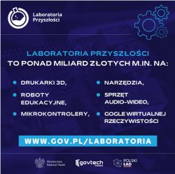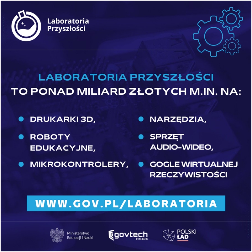 Laboratoria Przyszłości to inicjatywa edukacyjna realizowana przez Ministerstwo Edukacji i Nauki we współpracy z Centrum GovTech w Kancelarii Prezesa Rady Ministrów. Wspólną misją jest stworzenie nowoczesnej szkoły, w której zajęcia będą prowadzone w sposób ciekawy, angażujący uczniów oraz sprzyjający odkrywaniu ich talentów i rozwijaniu zainteresowań.
