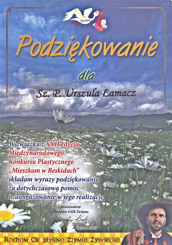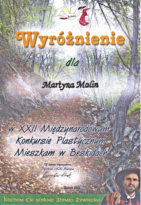 Martyna Molin z klasy 3a wzięła udział w XXII edycji Konkursu plastycznego "Mieszkam w Beskidach". Dostała nagrodę i dyplom wyróżnienia, który prezentujemy obok.