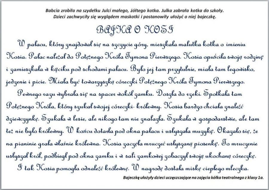 Teatr to nie tylko odgrywanie ról, ale również rozwijanie wyobraźni. Dzieci uczęszczające na kółko teatralne przeniosły się do magicznego świata i ułożyły bajeczkę.
