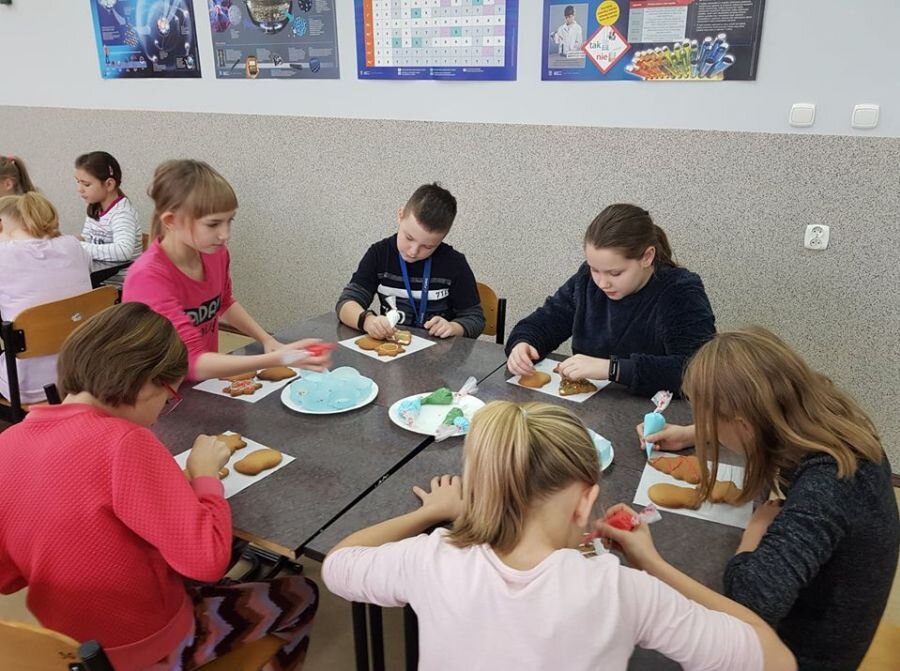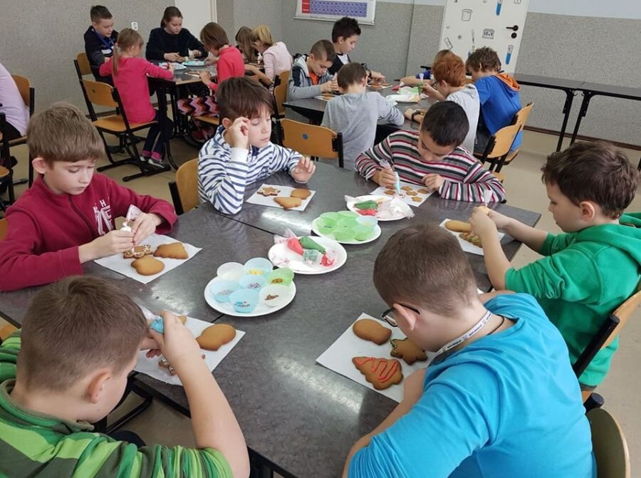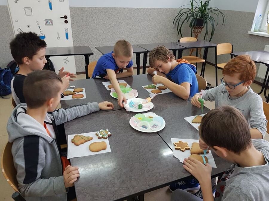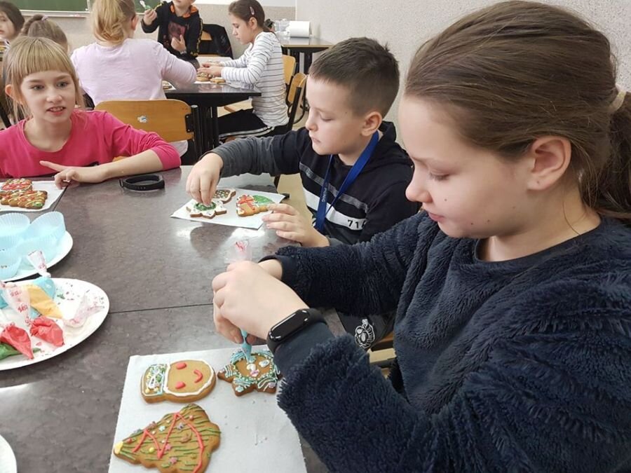 We wtorek 17 grudnia, uczniowie klasy 4a uczestniczyli w warsztatach zdobienia pierników. Warsztaty przeprowadziła pani Lucyna Adamczyk, która na co dzień zajmuje się cukiernictwem. Przez wiele lat doskonali swoje rzemiosło i cały czas dzieli się swoimi umiejętnościami z innymi. Pani Lucyna opowiedziała dzieciom jak upiec dobre pierniki, w jaki sposób zrobić najlepszy lukier oraz zdradziła kilka sekretów na temat zdobienia wypieków.