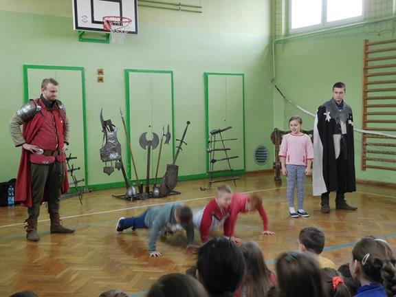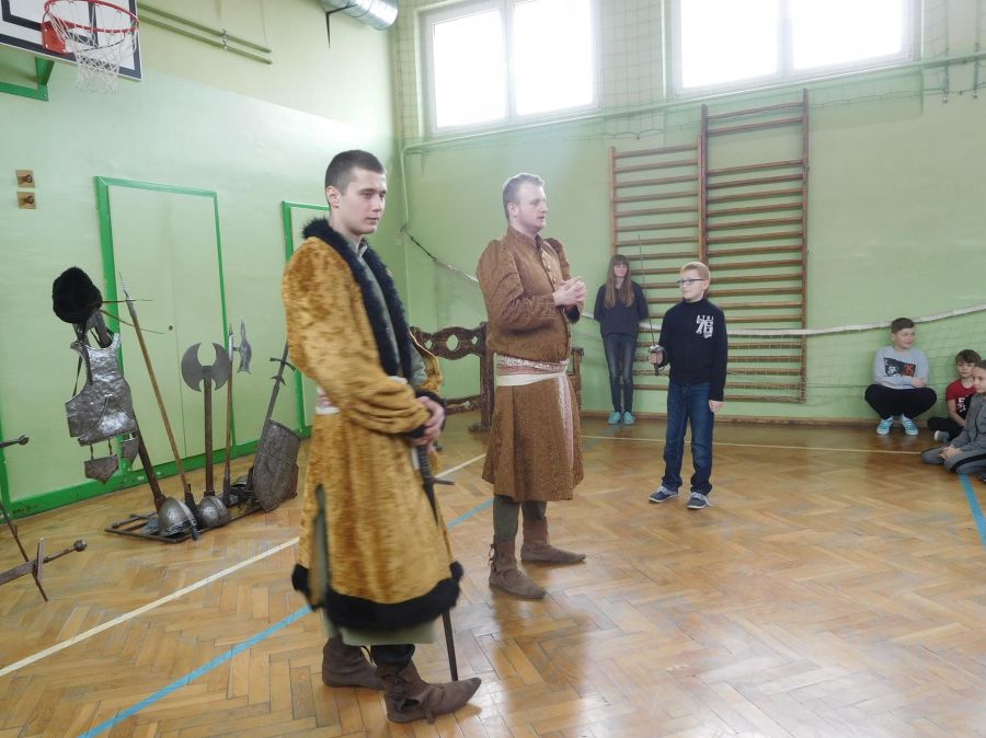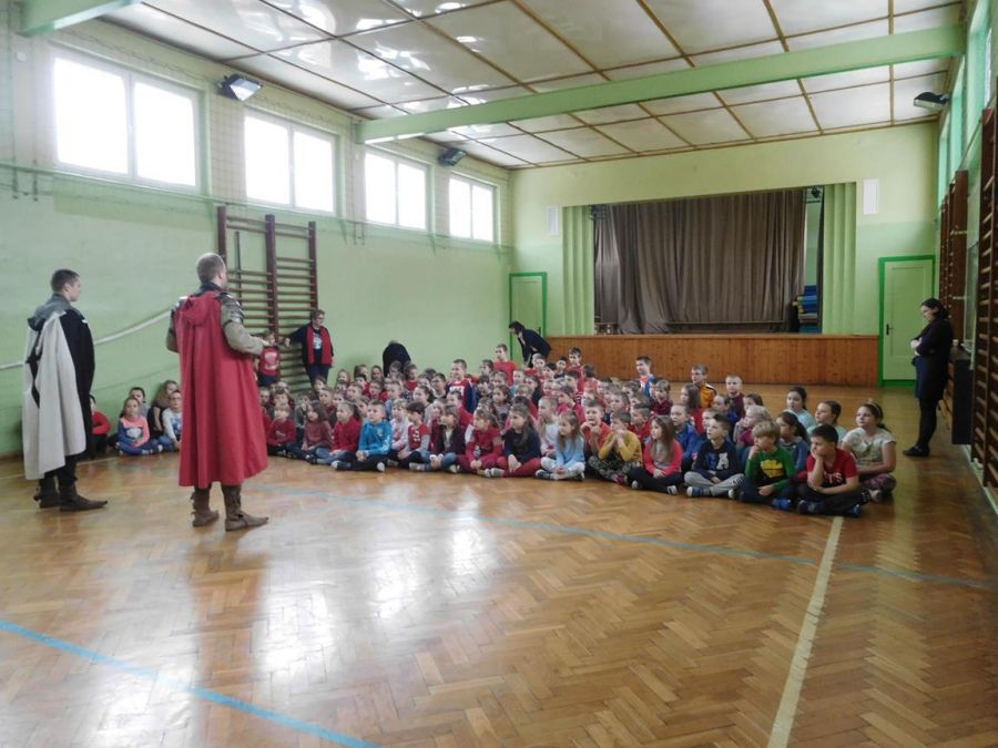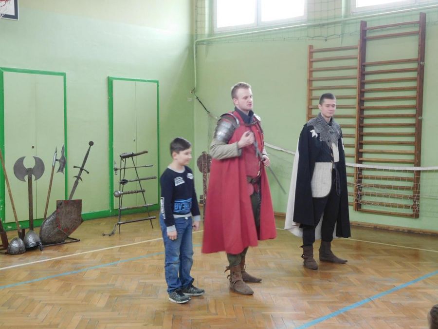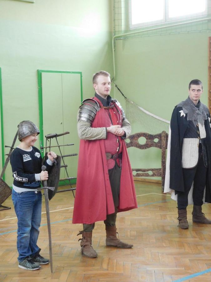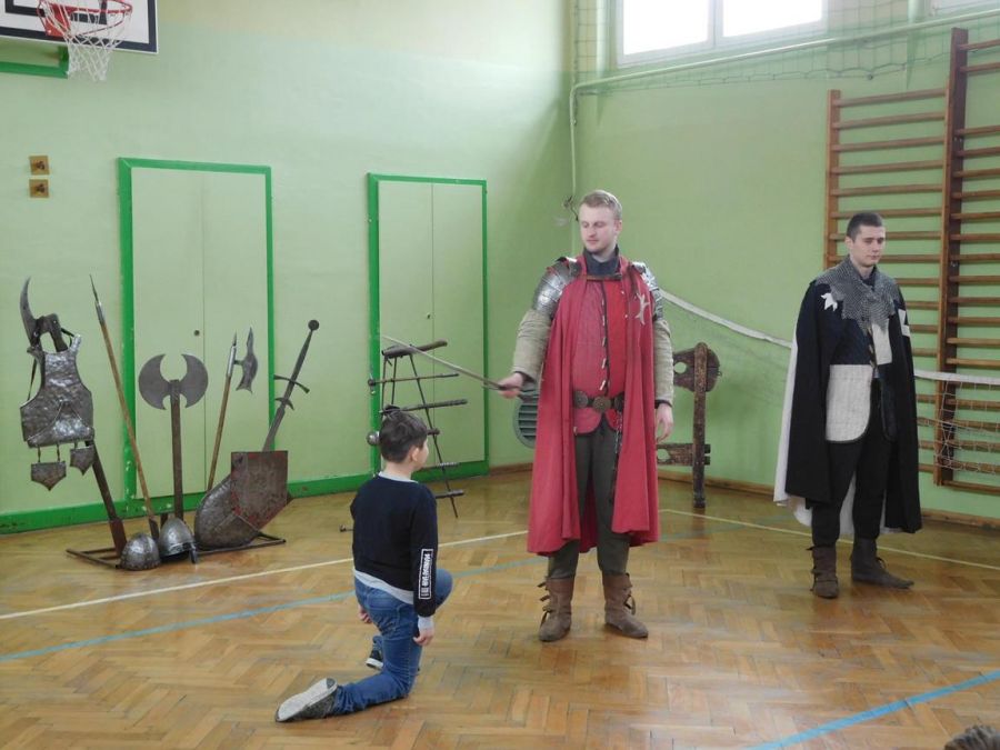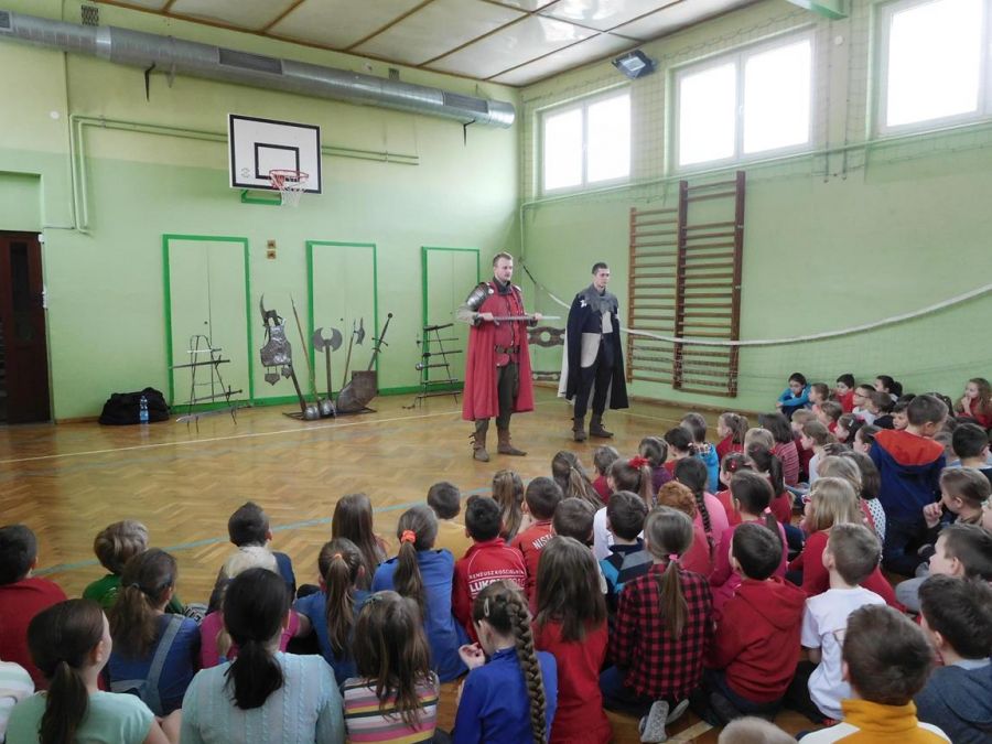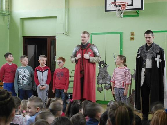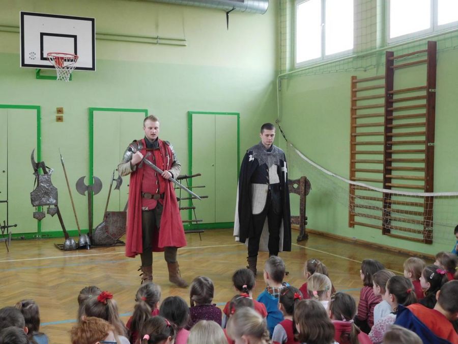 W naszej szkole z okazji Pierwszego Dnia Wiosny zostały zorganizowane warsztaty rycerskie. W warsztatach wzięli udział wszyscy uczniowie naszej szkoły. Celem warsztatów było zapoznanie dzieci z elementami życia codziennego w średniowieczu. Każdy uczeń mógł przymierzyć hełm, spróbować utrzymać rycerski miecz, stoczyć walkę z rycerzem oraz usiąść na krześle inkwizytorskim. Po warsztatach uczniowie klas 6 i 7 oraz nauczyciele wzięli udział w szkolnych rozgrywkach piłki siatkowej. Do rywalizacji przystąpiły 3 drużyny: drużyna dziewczyn, drużyna chłopców oraz drużyna nauczycieli. Pierwszy mecz rozegrał się między drużyną chłopców, a drużyną nauczycieli (2:0). Drugi mecz został rozegrany między drużyną dziewczyn