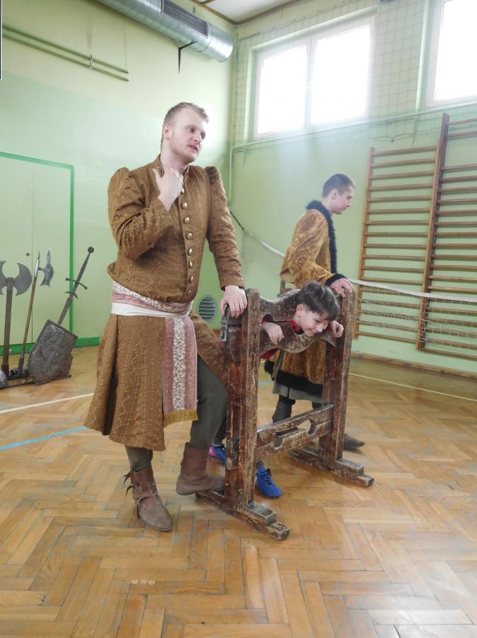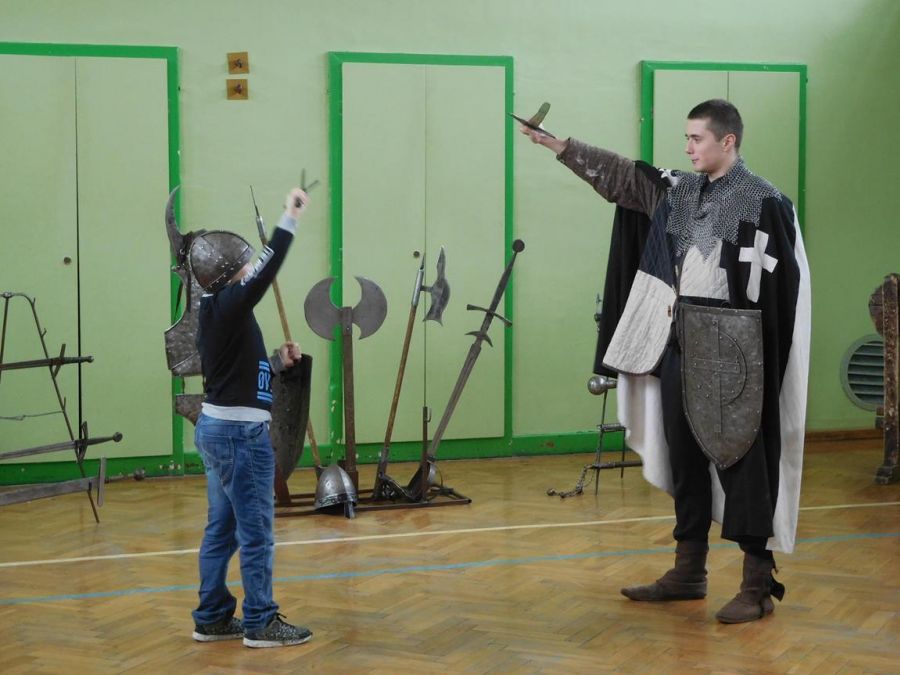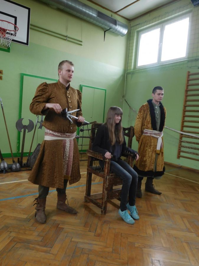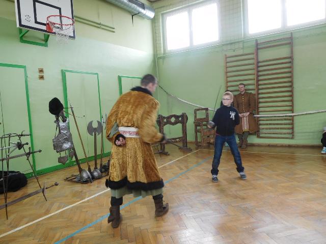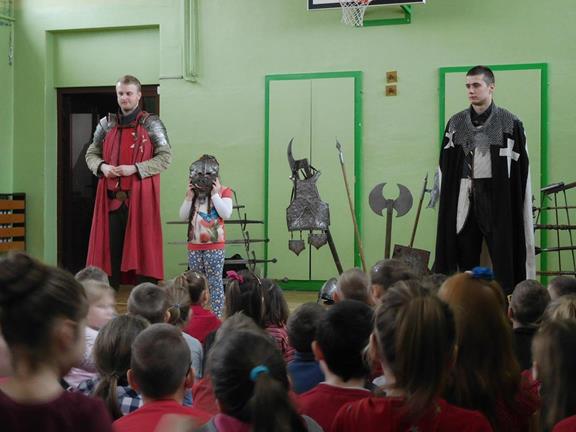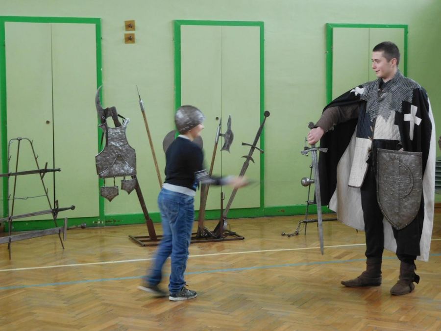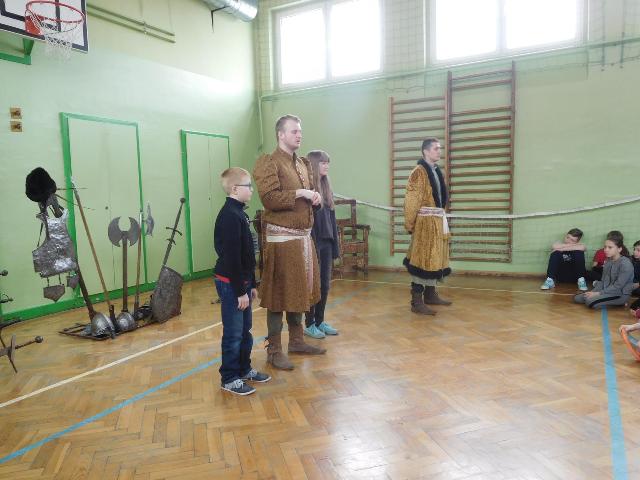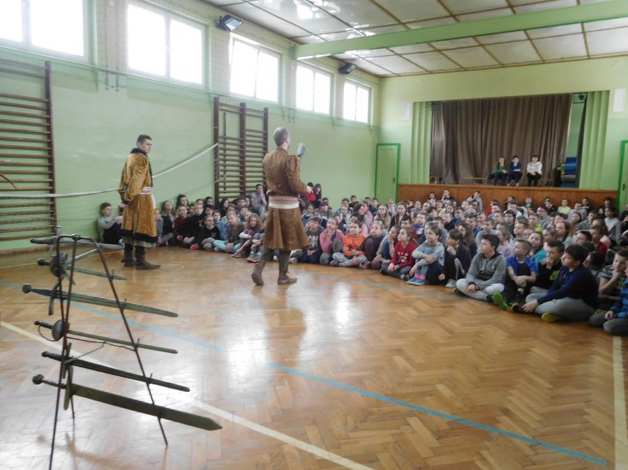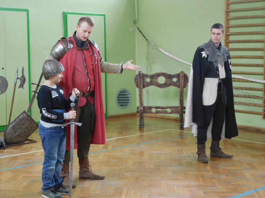 W naszej szkole z okazji Pierwszego Dnia Wiosny zostały zorganizowane warsztaty rycerskie. W warsztatach wzięli udział wszyscy uczniowie naszej szkoły. Celem warsztatów było zapoznanie dzieci z elementami życia codziennego w średniowieczu. Każdy uczeń mógł przymierzyć hełm, spróbować utrzymać rycerski miecz, stoczyć walkę z rycerzem oraz usiąść na krześle inkwizytorskim. Po warsztatach uczniowie klas 6 i 7 oraz nauczyciele wzięli udział w szkolnych rozgrywkach piłki siatkowej. Do rywalizacji przystąpiły 3 drużyny: drużyna dziewczyn, drużyna chłopców oraz drużyna nauczycieli. Pierwszy mecz rozegrał się między drużyną chłopców, a drużyną nauczycieli (2:0). Drugi mecz został rozegrany między drużyną dziewczyn