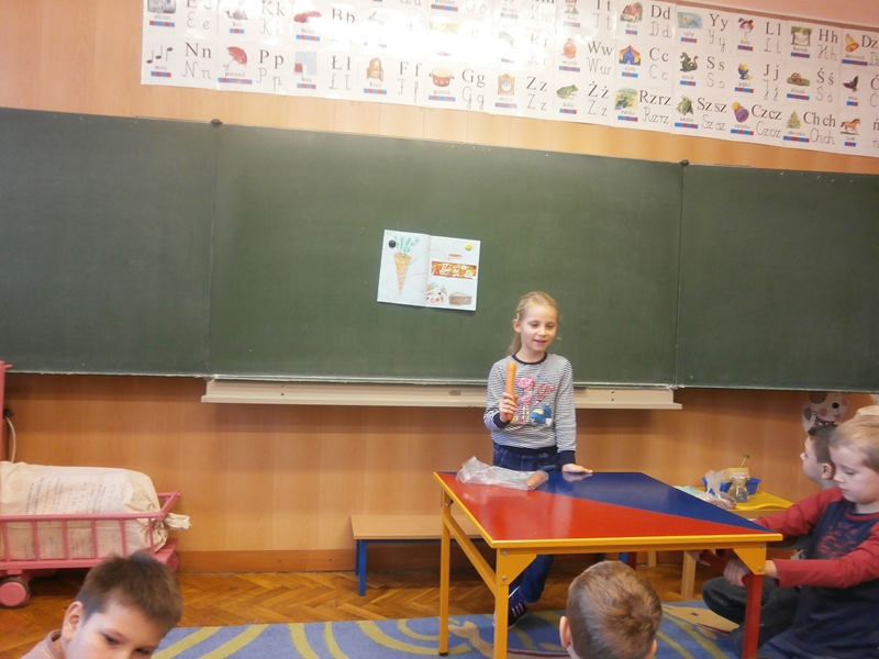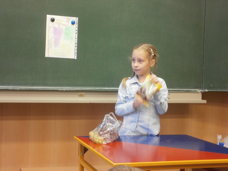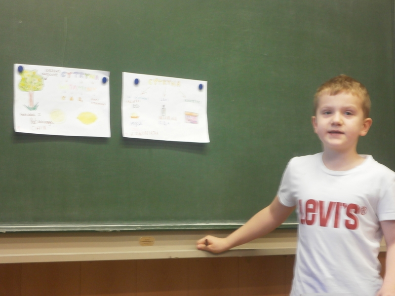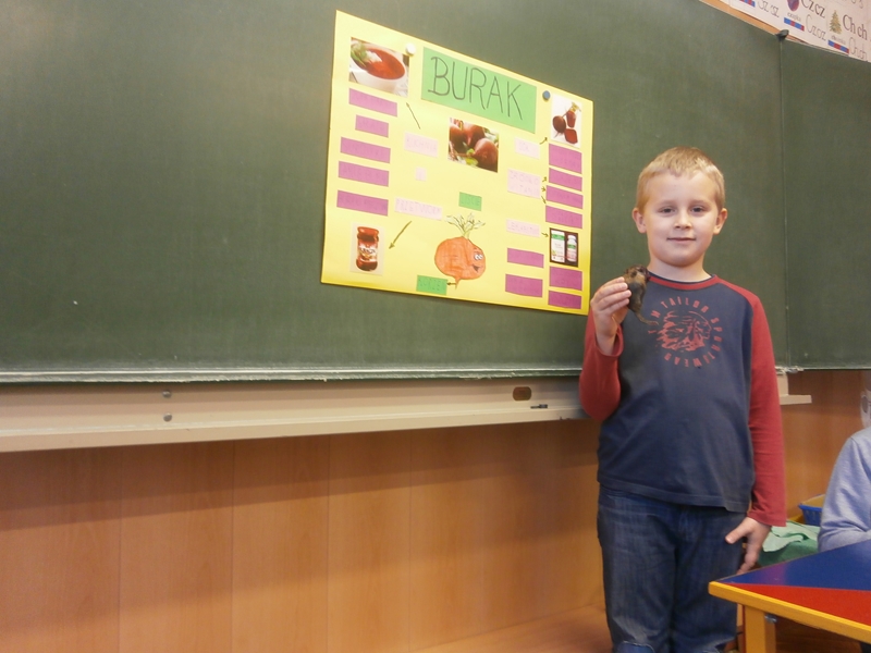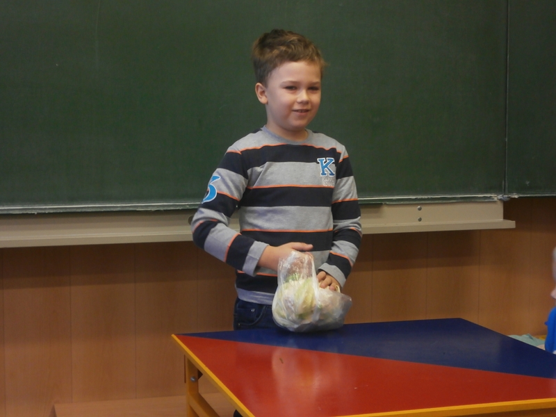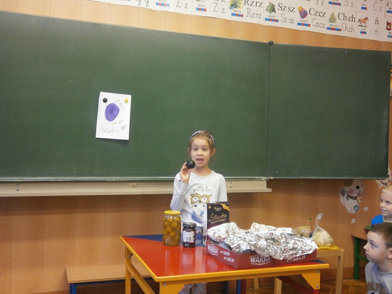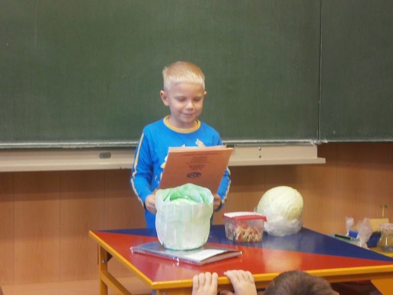 Jednym z jesiennych tematów realizowanych w ramach edukacji przyrodniczej jest poznanie warzyw i owoców oraz ich walorów zdrowotnych. Uczniowie z klasy 1 a przygotowali ciekawe prezentacje na ten temat. Każdy prezentował jedno warzywo lub owoc, opowiadał o nim i jego walorach zdrowotnych oraz o tym co można z niego zrobić. Po zakończeniu prezentacji uczniowie ze smakiem spożywali przyniesione okazy i wykonane z nich sałatki, przetwory, desery.