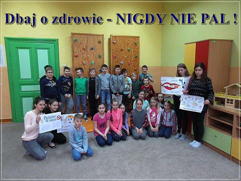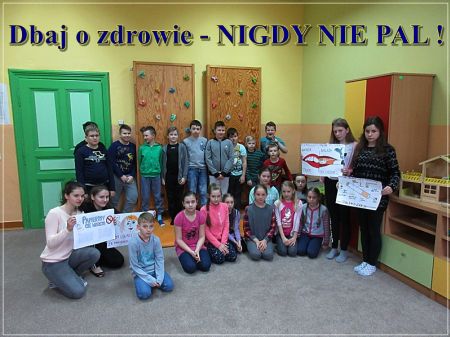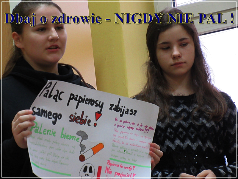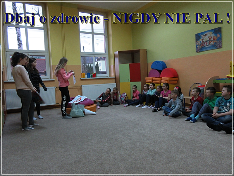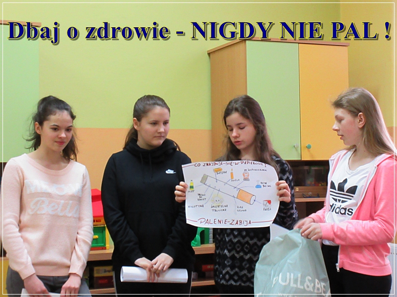 Uczennice z klasy 7b : Weronika Drabarczyk, Karolina Podżorska, Karolina Troszok, Jagoda Macura przygotowały ciekawą prelekcję na temat szkodliwości palenia tytoniu i wygłosiły ją w klasie 4a.