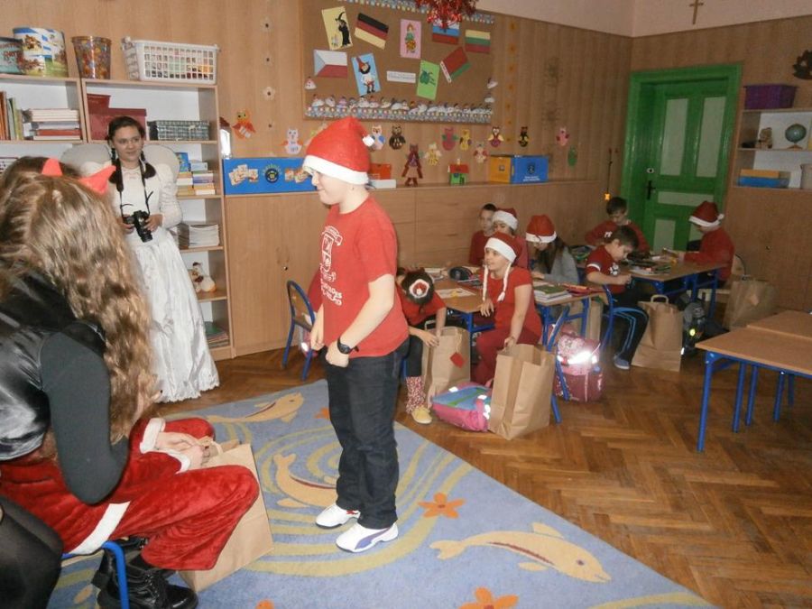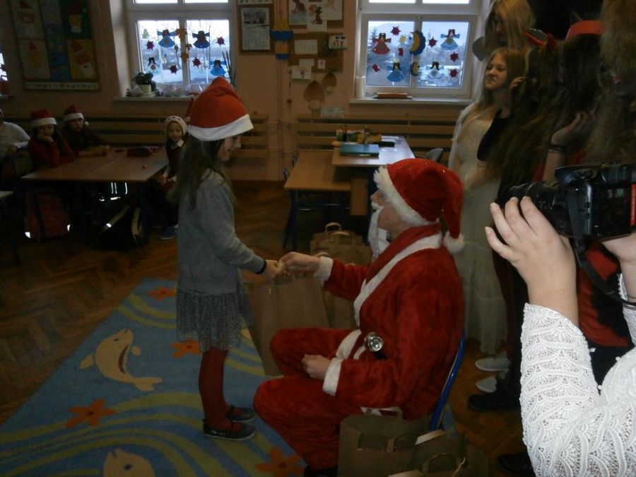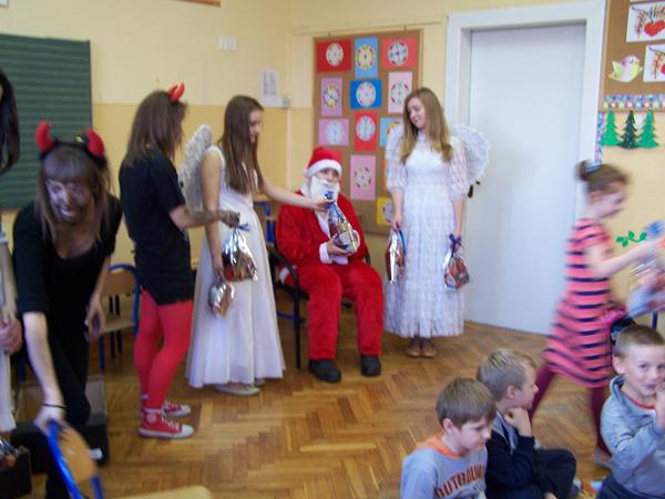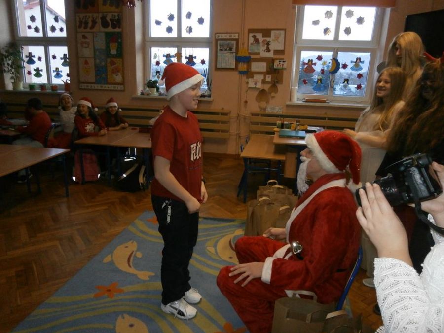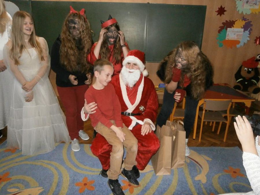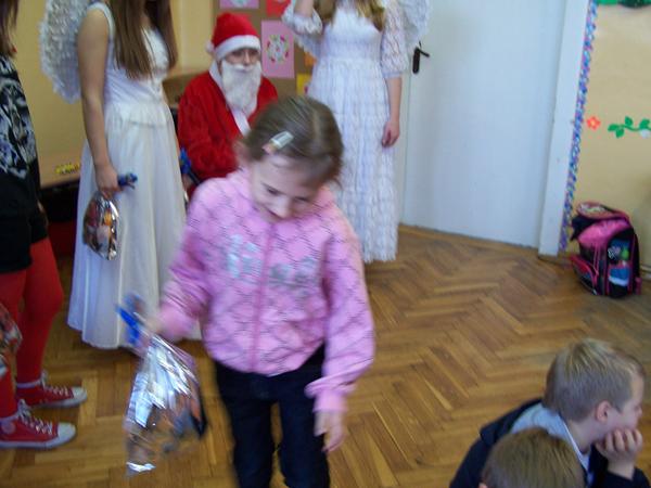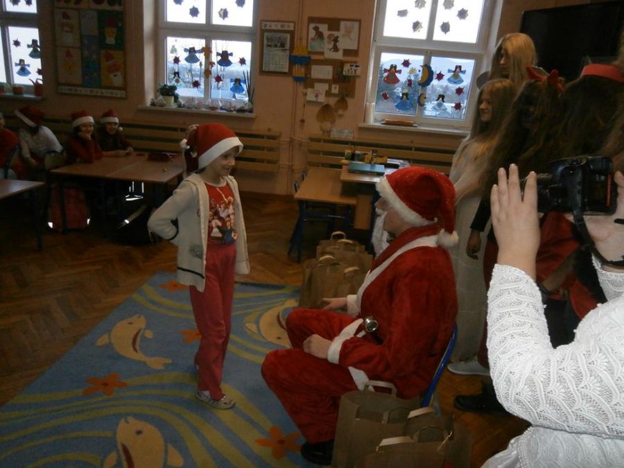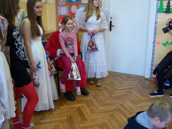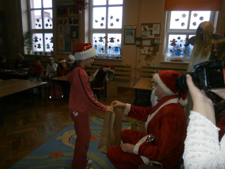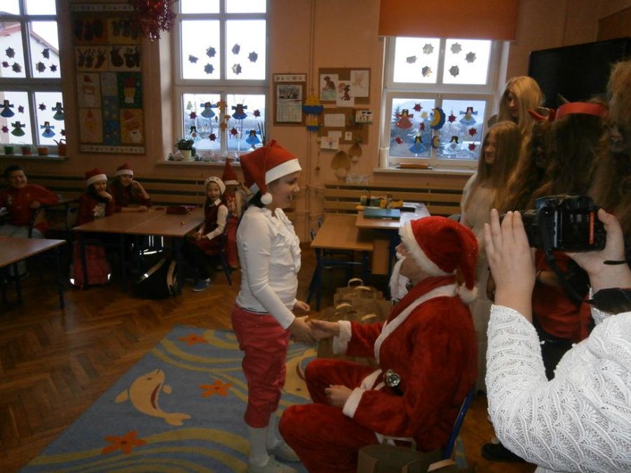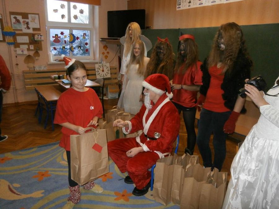 Uczniów klas 4-6 także odwiedziła ekipa Mikołaja, która obdarowała ich słodkim upominkiem.