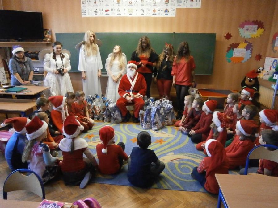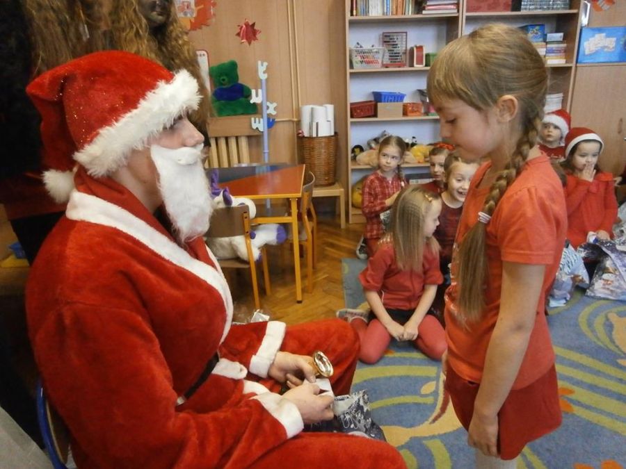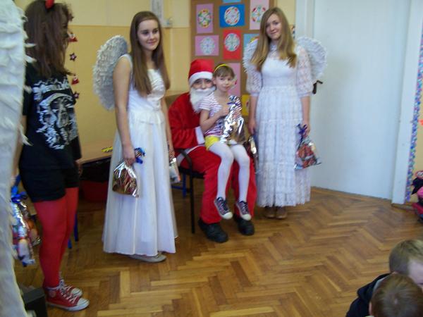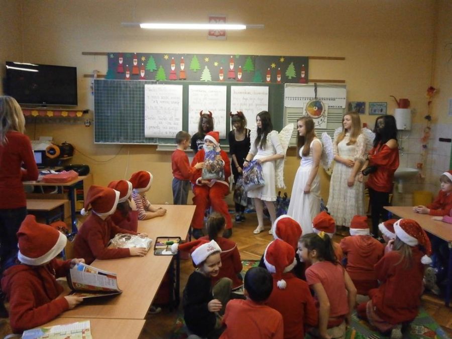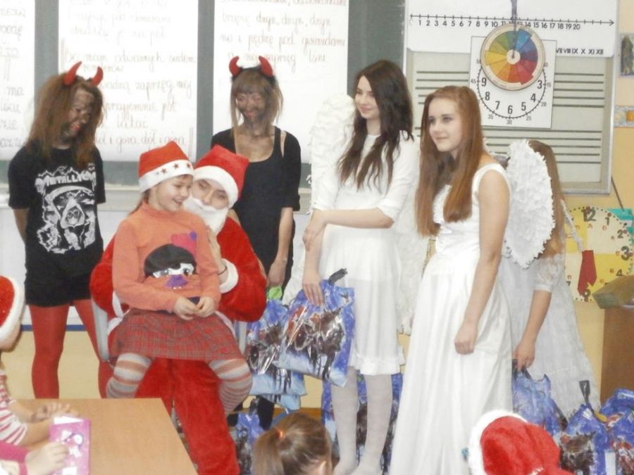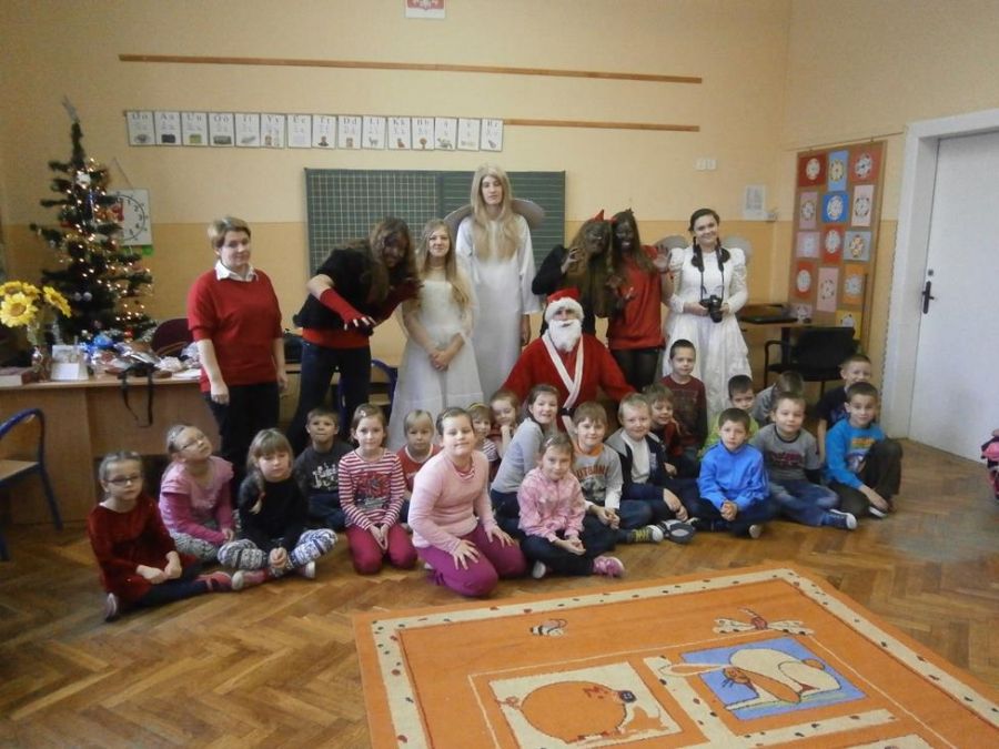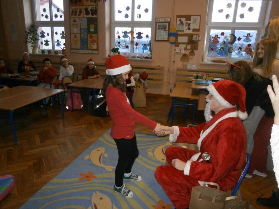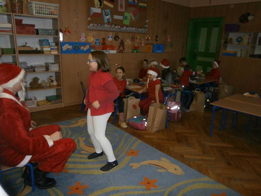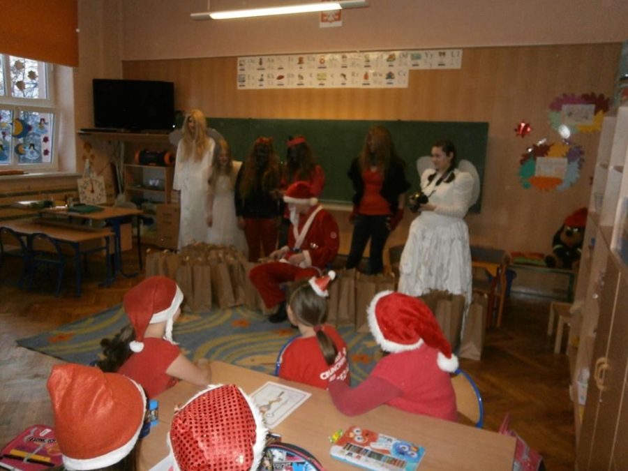 Uczniów klas 4-6 także odwiedziła ekipa Mikołaja, która obdarowała ich słodkim upominkiem.