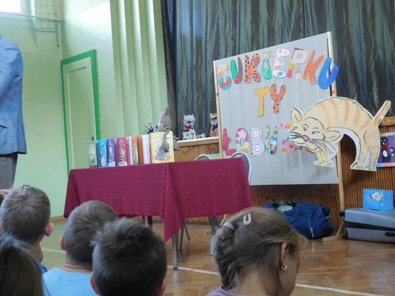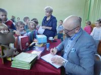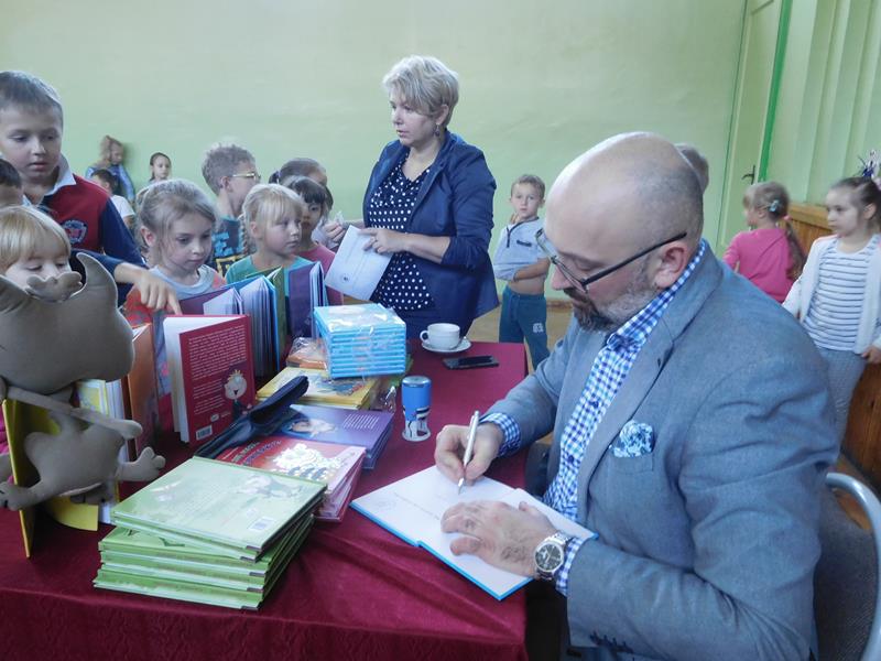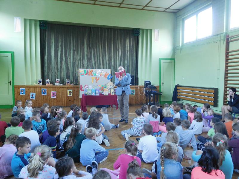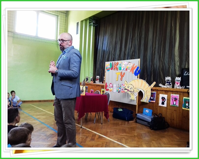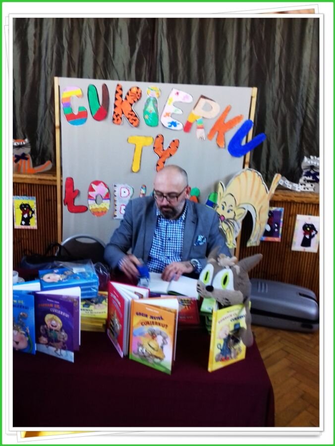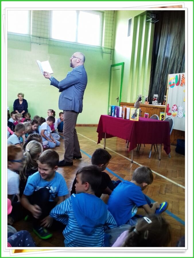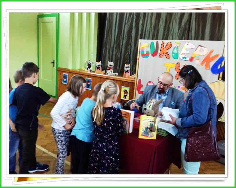 25 września odbyło się w naszej szkole spotkanie z Waldemarem Cichoniem, który napisał m.in. lekturę do klas 1-3 pt. "Cukierku, ty łobuzie". Autor książek dla dzieci opowiadał historię kotka, odpowiadał na pytania uczniów a na zakończenie dawał dzieciom autografy do książek.