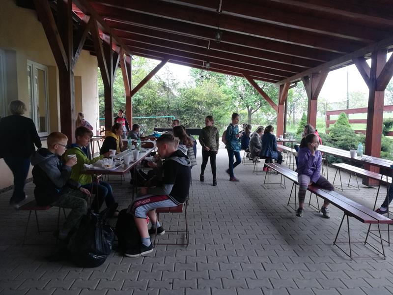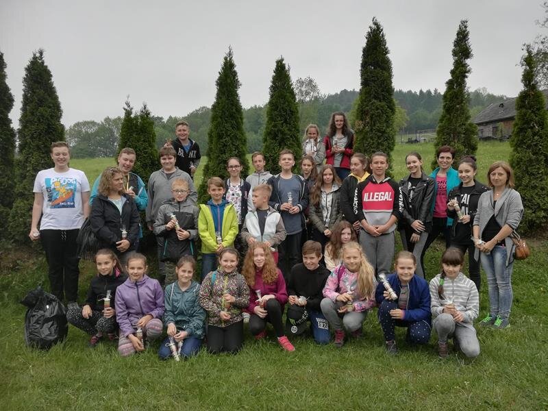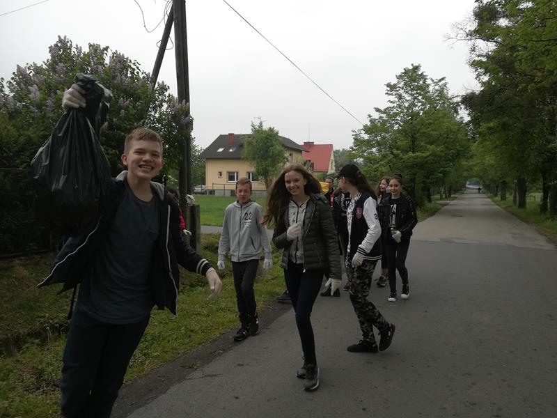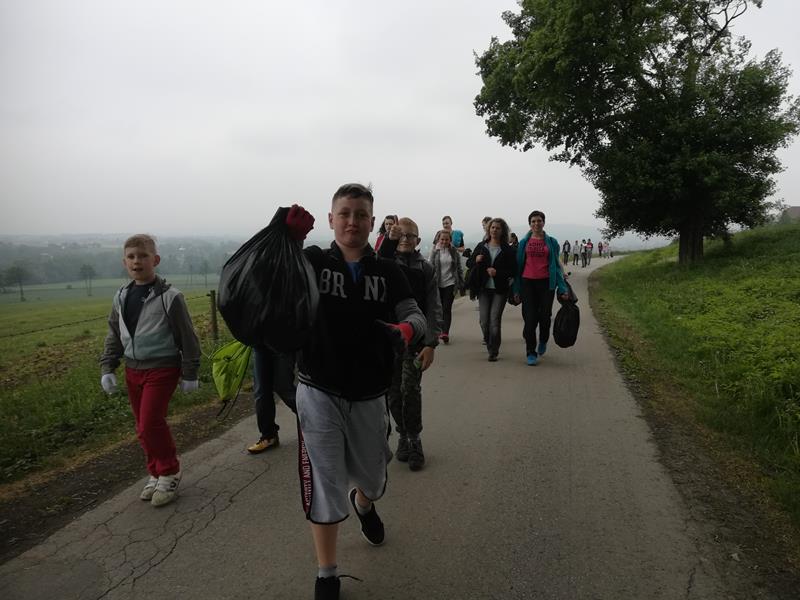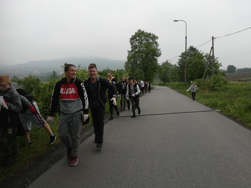 Sprzątanie świata rozpoczęliśmy o godzinie 9:30 w piątek 4 maja. Na początek otrzymaliśmy wodę i coś słodkiego, aby w czasie drogi nikomu z nas nie zabrakło sił i wytrwałości w działaniu. Trasa nie była odległa, ale zajęła nam ponad godzinę drogi. Po dotarciu na miejsce, razem z naszymi wychowawczyniami p. Małgorzatą Kuschnik i p. Dorotą Wisełką oraz p. Agnieszką Sztwiertnię - opiekuna, zostaliśmy przywitani przez p. sołtys wsi Godziszów i przedstawiciela OSP Godziszów. Otrzymaliśmy ciepłą herbatę oraz coś do przekąszenia. Po krótki odpoczynku wróciliśmy do szkoły na obiad.