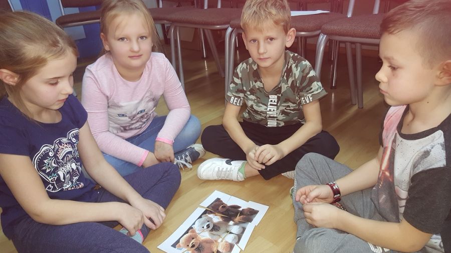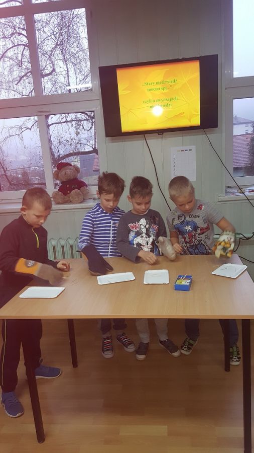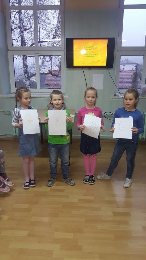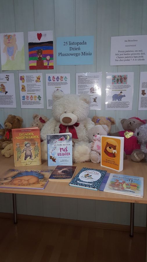 25 listopada swoje święto obchodził najmilszy, najprawdziwszy przyjaciel dzieci – Pluszowy Miś. 26 i 27 listopada do wspólnej zabawy z misiami biblioteka szkolna zaprosiła uczniów klas pierwszych. Mali goście zapoznali się z historią powstania pierwszego pluszowego misia, przypomnieli sobie w jakich bajkach występują te sympatyczne maskotki. Wysłuchali także fragmentu audiobook’a pt.: „Pamiętnik Czarnego Noska”. Przy okazji dowiedzieli się co to jest audiobook. Najwięcej frajdy sprawiły pierwszakom różnorodne konkurencje – rysowanie misia z zamkniętymi oczami, wyjadanie miodku z talerzyka oraz zbieranie wykałaczek kuchenną rękawicą. W przerwie między zadaniami nauczyli się krótkiej rymowanki o niedźwiadku. Podczas quizu mogli wykazać się wiedzą na temat zwyczajów niedźwiedzi. Na koniec spotkania goście obejrzeli wystawę misiów oraz książek, których bohaterami są te wspaniałe zwierzaki. Nie obyło się oczywiście bez zaśpiewania solenizantowi „Sto lat”. W zamian za wspaniałe życzenia Miś poczęstował każdego małym co nieco.