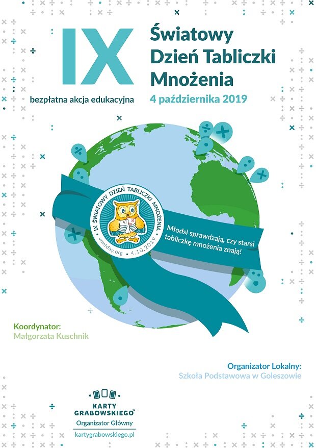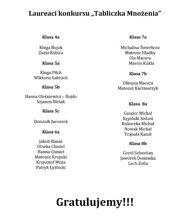 4 października obchodzimy Światowy Dzień Tabliczki Mnożenia i z tej okazji w naszej szkole został zorganizowany konkurs tabliczki mnożenia. W konkursie brali udział uczniowie klas 4 - 8. Wyłonieni zostali laureaci i nagrodzeni 6 z matematyki, pozostali - biorący udział - otrzymali ocenę 5. Gratulujemy wszystkim uczestnikom! Konkurs został zorganizowany przez