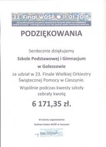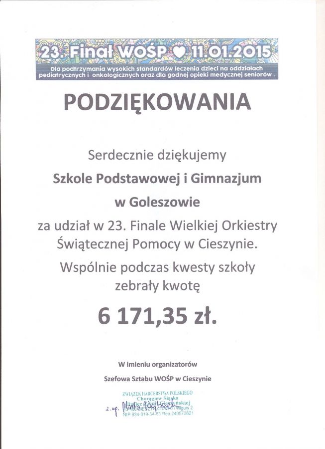 Już po raz kolejny Wielka Orkiestra Świątecznej Pomocy zagrała w Goleszowie. Koncert odbył się w Szkole Podstawowej w Goleszowie. Jego organizatorami była Szkoła Podstawowa w Goleszowie oraz Gimnazjum w Goleszowie. Na scenie zaprezentowało się wielu artystów z obu szkół, grupy teatralne i taneczne. Oprócz występów artystycznych zorganizowano okolicznościową wystawę „Oblicza Afryki, oblicza życia” przedstawiającą realia dnia codziennego mieszkańców Burkina Faso. Wystawa to wspomnienia absolwentki SP Goleszów dr Lidii Żur z wyjazdów misyjnych do Afryki w latach 2008 – 2014. Atrakcją dnia był także słodki bufet zorganizowany przez gimnazjalistów. Na rzecz WOŚP przekazany został także tort i podarunek od Wójta Gminy Goleszów Krzysztofa Glajcara. Zebrana kwota to 6 171,35 zł