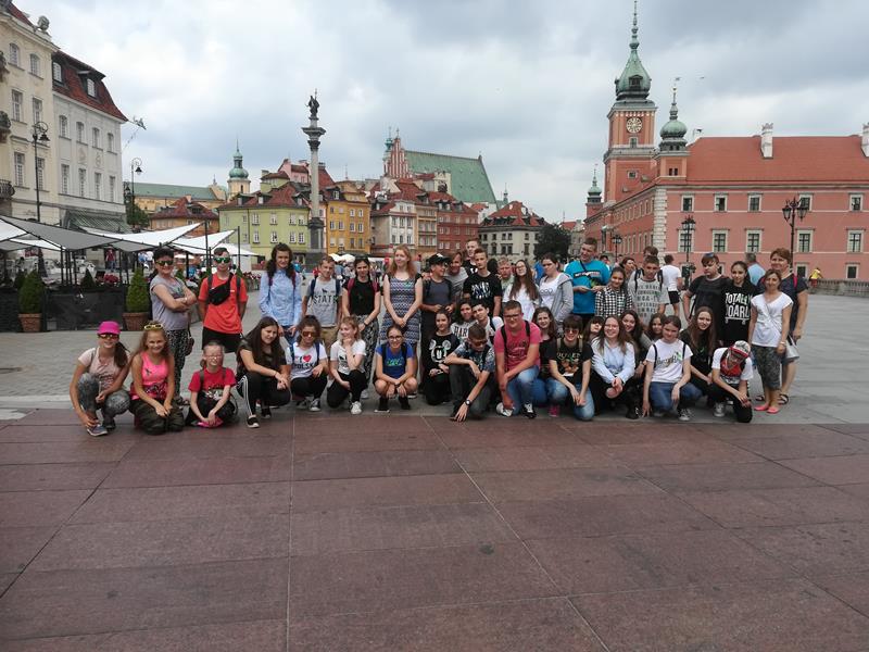 W związku z 100 rocznicą odzyskania przez Polskę niepodległości zorganizowaliśmy wycieczkę do stolicy Polski. Tę daleką podróż rozpoczęliśmy o godzinie 5:00 w poniedziałek 4 czerwca 2018r. a zakończyliśmy trzy dni później – 6 czerwca w środę. Tuż po przyjeździe na miejsce nasze zwiedzanie rozpoczęliśmy od zwiedzania obiektu Telewizji. Dowiedzieliśmy się jak powstają programy telewizyjne, patrzyliśmy przez kamery, zasiadaliśmy w miejscach, gdzie na co dzień kręcone są wywiady, programy rozrywkowe czy informacyjne. Kolejnym punktem naszej wycieczki było podziwianie Warszawy z punktu widokowego Pałacu Kultury i Nauki. Wzniesiony on został w latach 1952-1955 w centralnym punkcie miasta. Wraz z iglicą mierzy 234 metry wysokości i jest siedzibą bardzo wielu instytucji, Pałacu Młodzieży, kin, teatrów, restauracji i sklepów. Szliśmy koło Kościoła św. Anny, podziwialiśmy Pałac Radziwiłłów. Widzieliśmy Grób Nieznanego Żołnierza, który powstał w 1925r. dla uczczenia poległych podczas I wojny światowej. Na miejsce Grobu wykonano kolumnadę pałacu Saskiego. Obecny pomnik ma charakter ruiny – symbolu. Znajdują się tam szczątki poległego żołnierza, urny z ziemią z pobojowisk i tablice z nazwami pól bitewnych z I i II wojny światowej. Na placu Piłsudskiego, przy Grobie Nieznanego żołnierza odbywają się uroczystości państwowe. My byliśmy świadkami uroczystej zmiany warty w tym miejscu. Następnie przechodziliśmy obok najstarszego hotelu w Warszawie na Krakowskim Przedmieściu, kancelarii Premiera, pomnika Adama Mickiewicza aż doszliśmy do Starego Miasta. Stare Miasto to jedno z najpiękniejszych miejsc w Warszawie. Dumą Warszawiaków jest Zamek Królewski, który stoi na miejscu pierwszego drewnianego grodu obronnego wzniesionego pod koniec XIII w. przez książąt mazowieckich. W centrum usytuowana jest Kolumna Zygmunta. Pomnik ten powstał w 1644 r. na zlecenie Króla Władysława IV, który w ten sposób uczcił pamięć swojego ojca – Zygmunta III Wazy. Przechadzając się ulicami Starówki widzieliśmy Pomnik Małego Powstańca i Pomnik Syrenki oraz liczne uliczki. Przejeżdżaliśmy przez Plac Trzech Krzyży, widzieliśmy Trasę W-Z, jechaliśmy pierwszymi w Warszawie ruchomymi schodami. Ostatnią atrakcją dnia pierwszego był Stadion Narodowy, gdzie mogliśmy zobaczyć z bliska miejsce rozgrywek sportowych, koncertów i innych atrakcji tego obiektu.