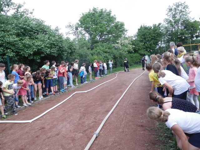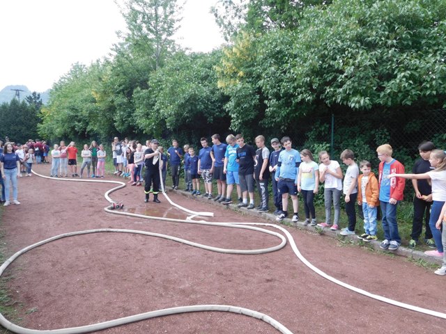 „Ze strażą pożarną bezpiecznie”. Zacięta rywalizacja przyniosła naszym drużynom 4 i 5 miejsce. Wszyscy uczniowie szkoły mogli zaznajomić się ze sprzętem strażackim, w szczególności z wyeksponowanymi samochodami strażackimi i ich wyposażeniem. Na oglądających i zainteresowanych pożarnictwem czekała słodka przekąska i napoje. Na zakończenie zawodów uczniowie mogli zobaczyć pokaz strażacki wykonany przez druhów reprezentujących jednostki Ochotniczej Straży Pożarnej z gminy Goleszów.