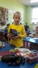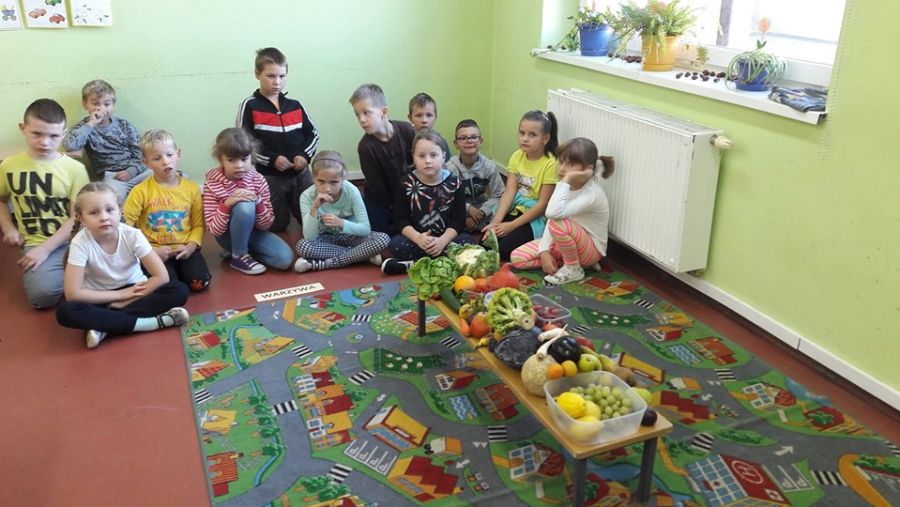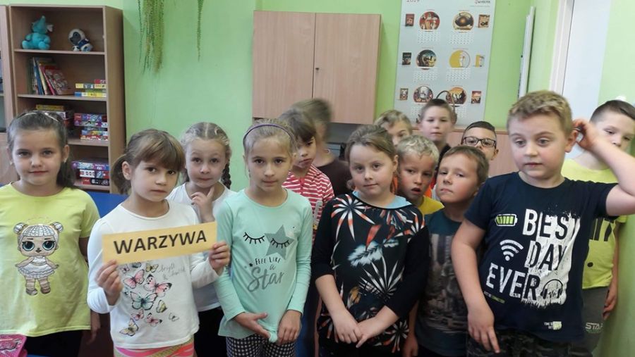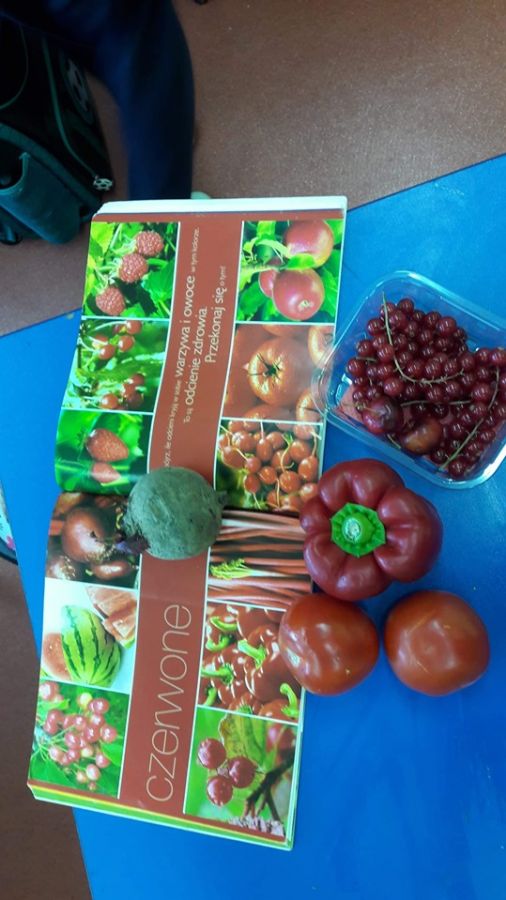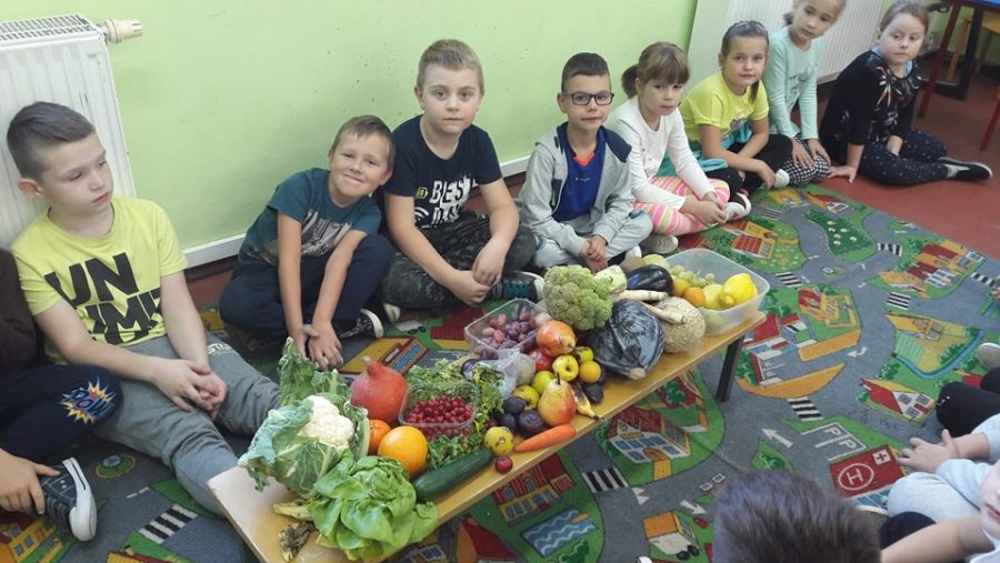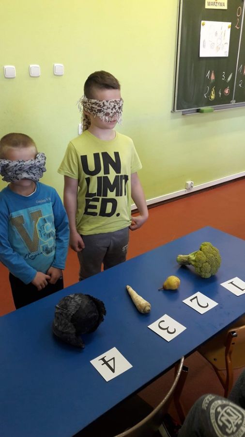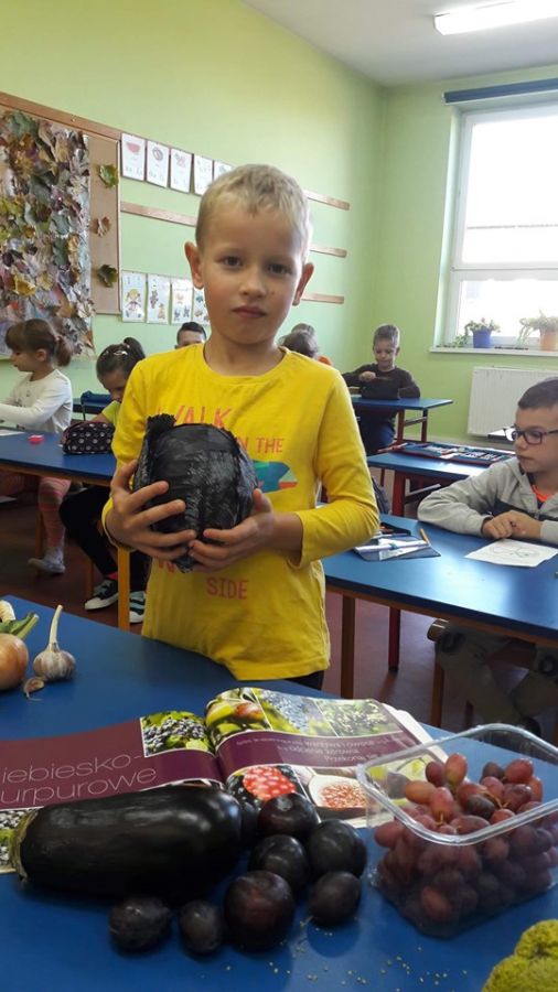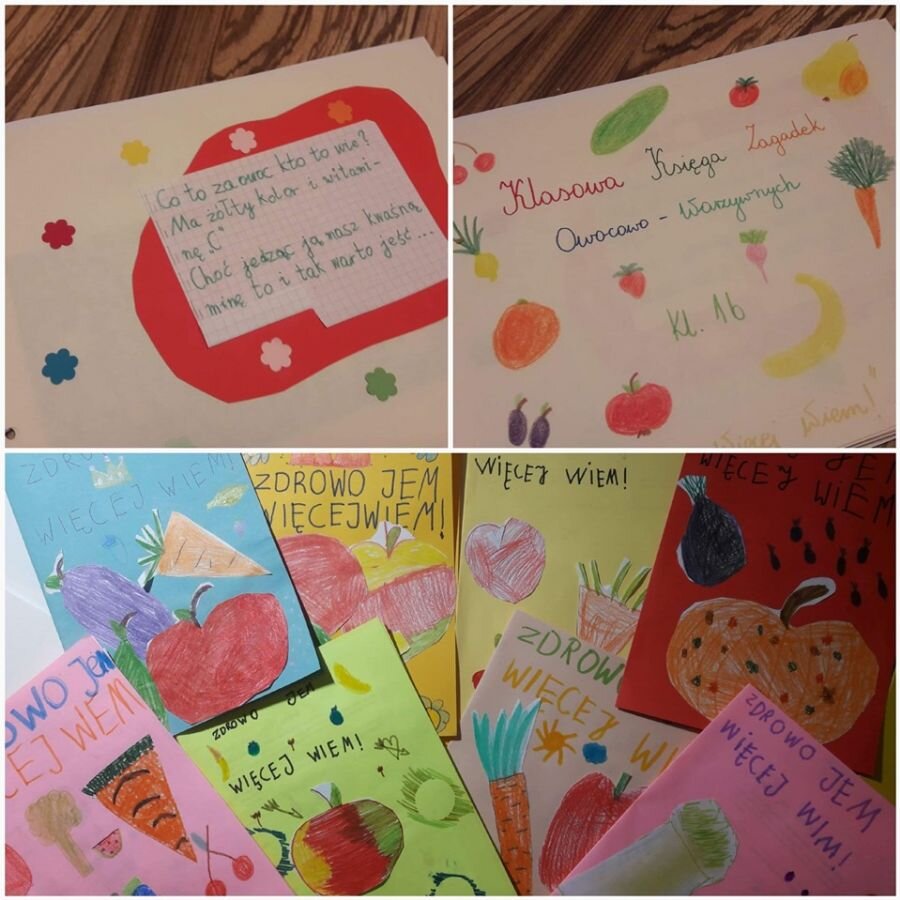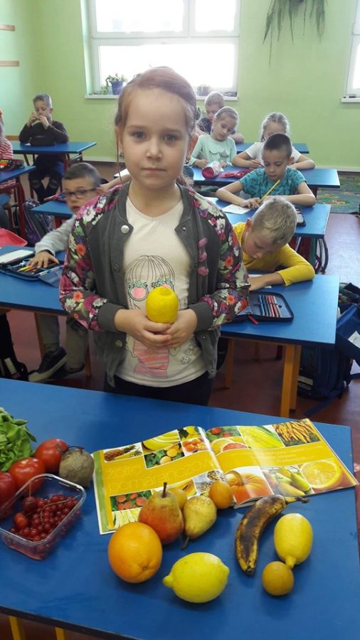 Klasa 1b przystąpiła do projektu: „Zdrowo jem, więcej jem!”, którego celem jest wykształcenie u dzieci postaw prozdrowotnych poprzez uczenie zasad zdrowego odżywiania. W związku z tym została przeprowadzona lekcja o owocach i warzywach, podczas której dzieci nauczyły się rozpoznawać owoce i warzywa za pomocą zmysłów: wzroku, dotyku, smaku. Zapoznały się z pięcioma grupami kolorystycznymi owoców i warzyw, a także jaką wartość odżywczą mają owoce i warzywa oraz jaką odgrywają rolę w ich codziennej diecie. Dzieci wzięły udział w zabawie ruchowej do piosenki pt. „Witaminki” oraz razem z rodzicami napisały wierszyki i zagadki o poznanych owocach i warzywach, i stworzyły Klasową Księgę Zagadek Owocowo – Warzywnych.